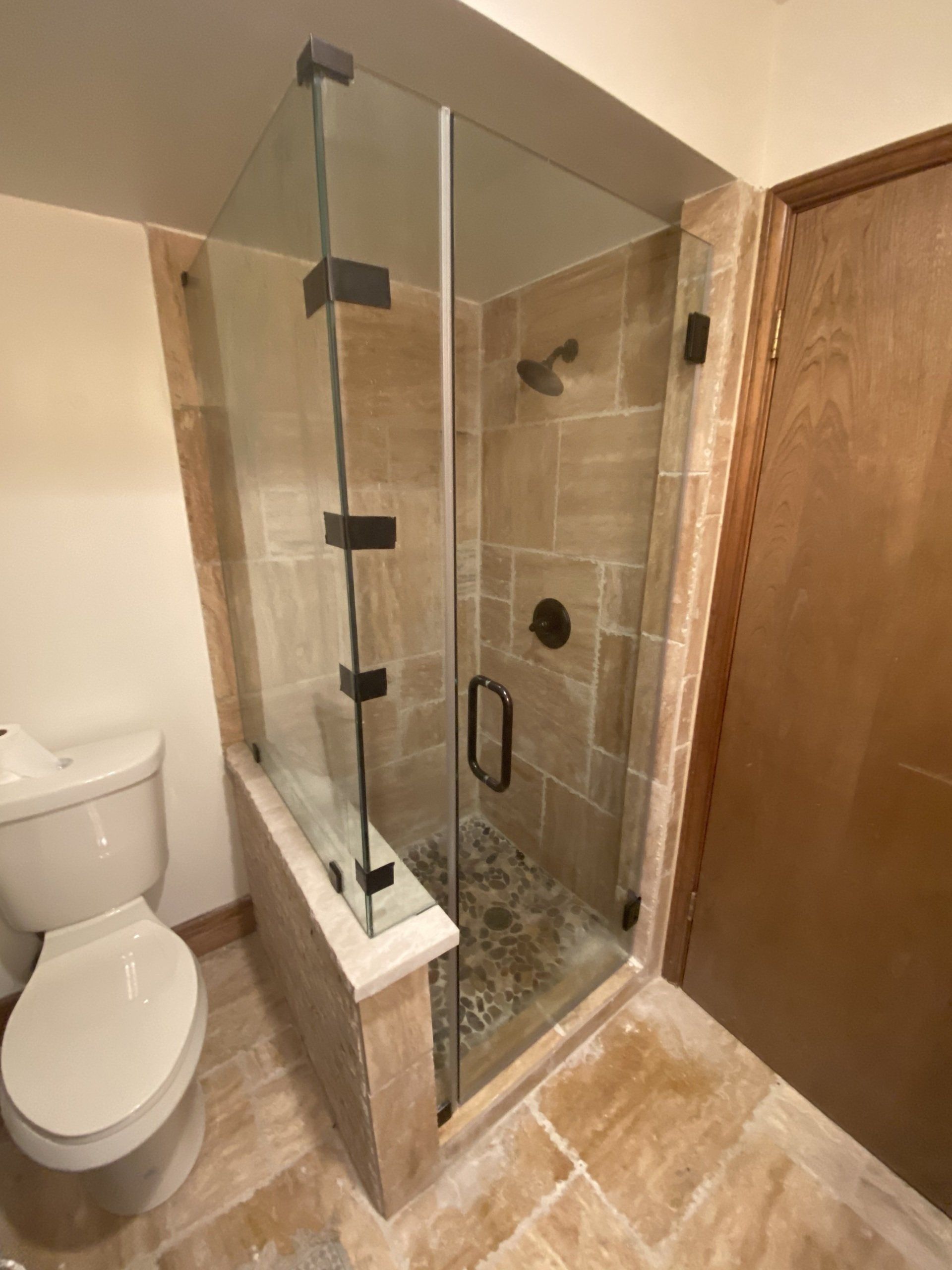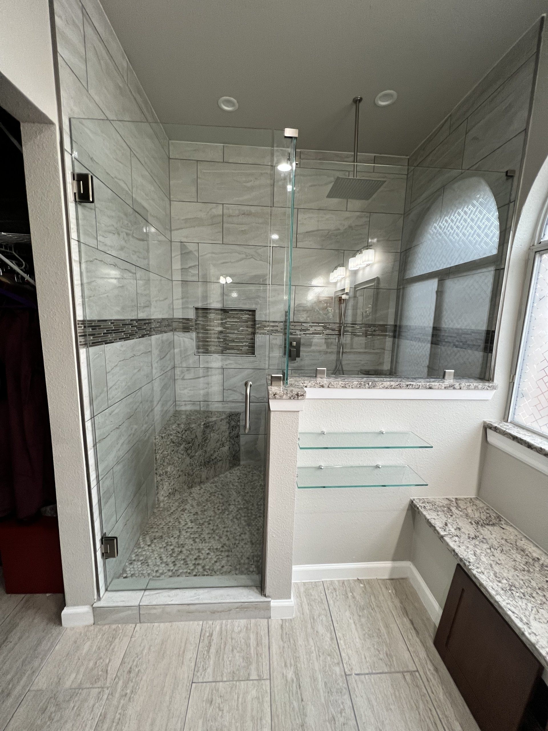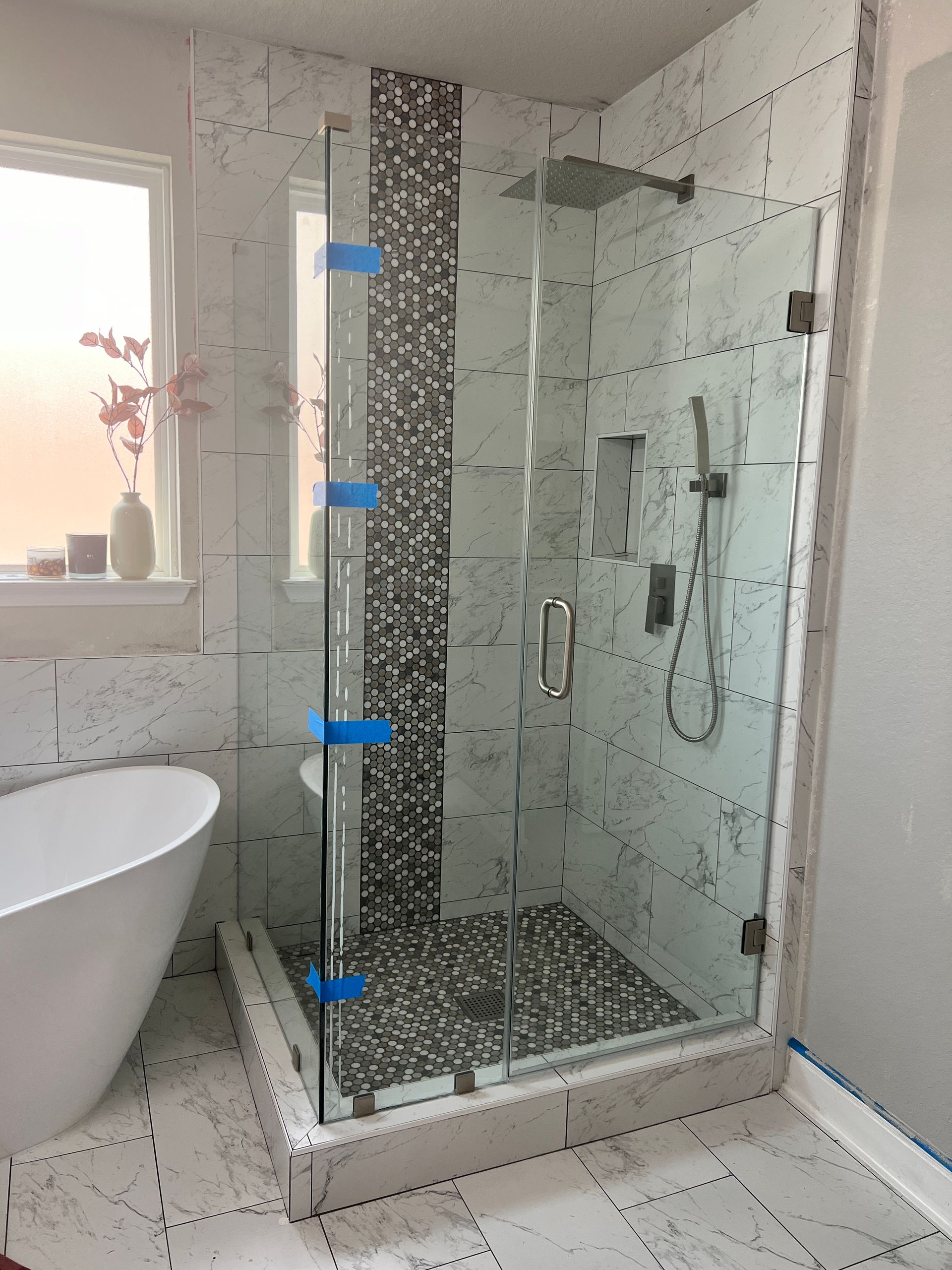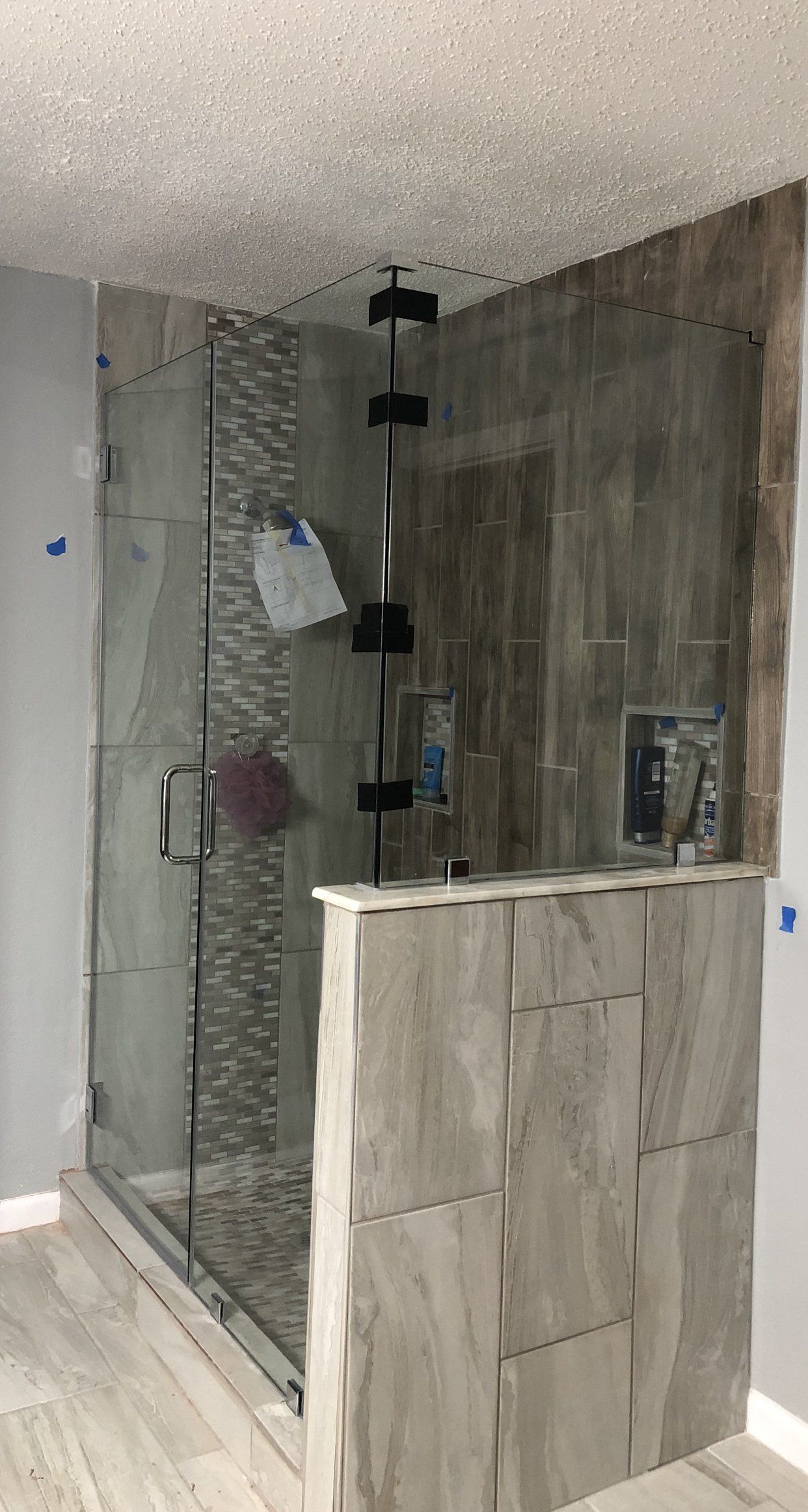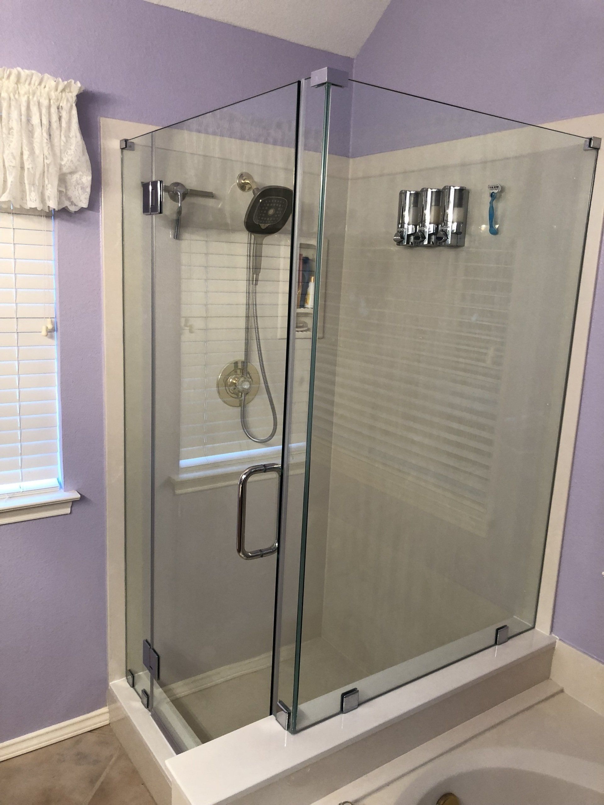 CUSTOM DESIGN 90 DEGREE STYLE SHOWER ENCLOSURE WITHOUT TRANSOM GLASS ABOVE DOOR FOR VENTILATION PER CUSTOMER REQUEST. BRUSH NICKEL FINISH HARDWARE ON CLEAR GLASS. KNOB STYLE HANDLE.