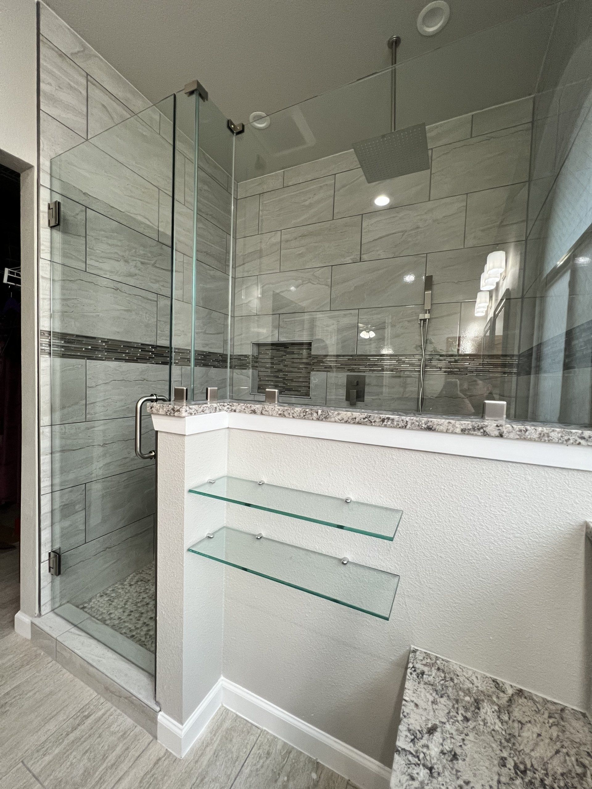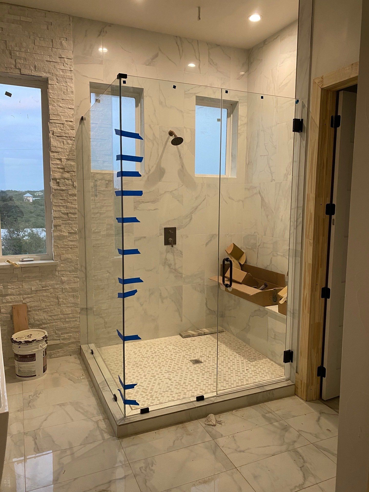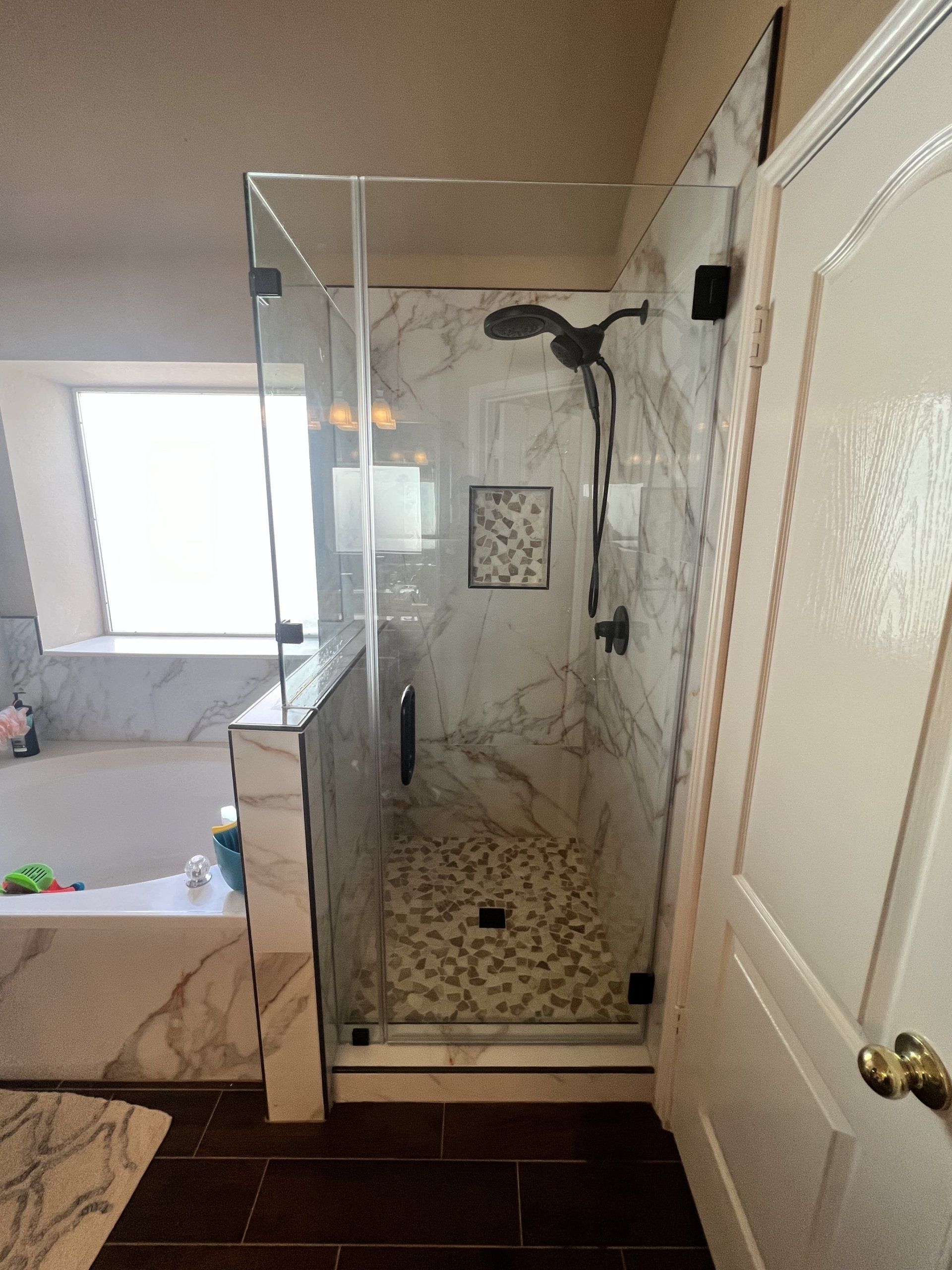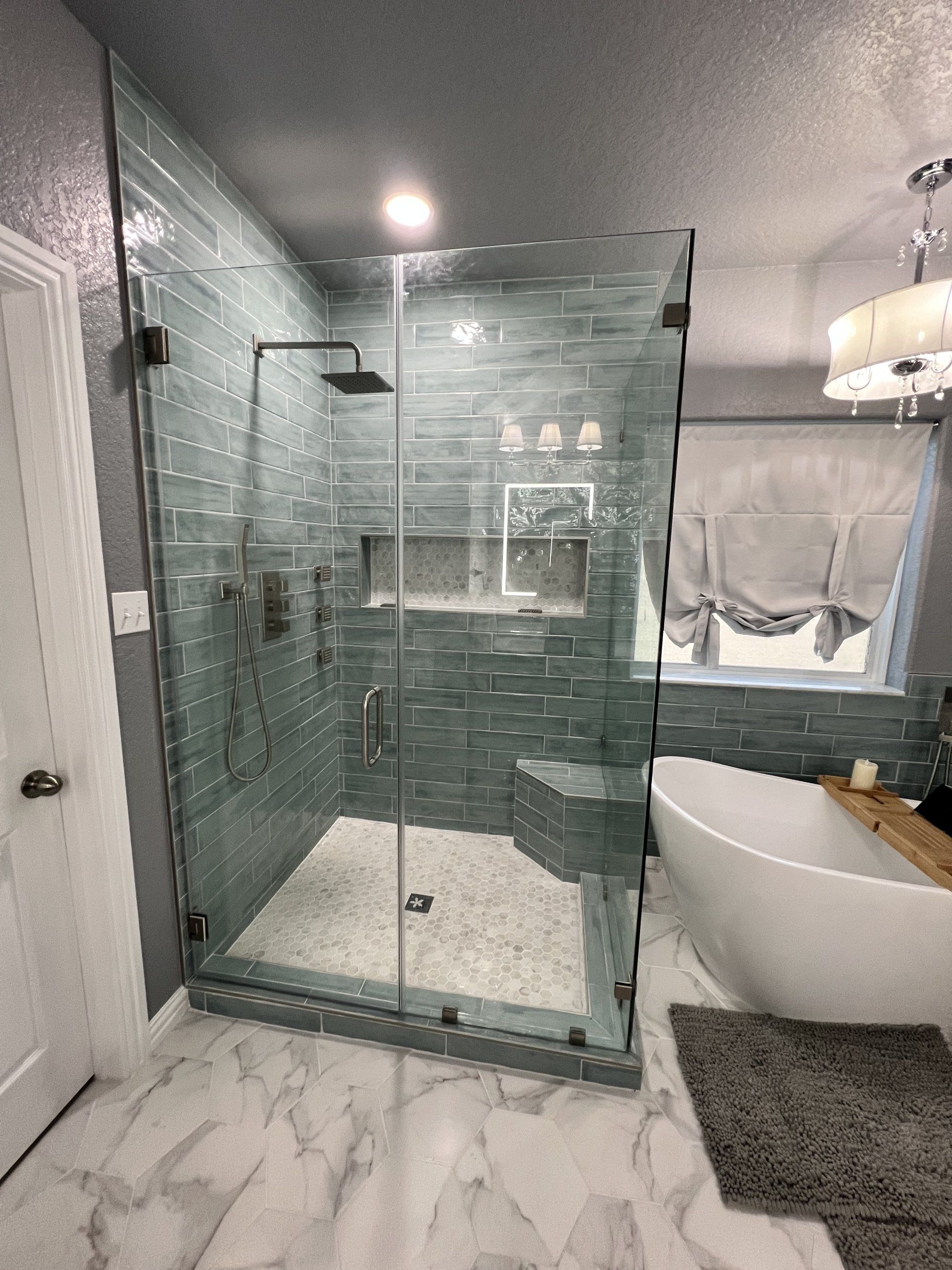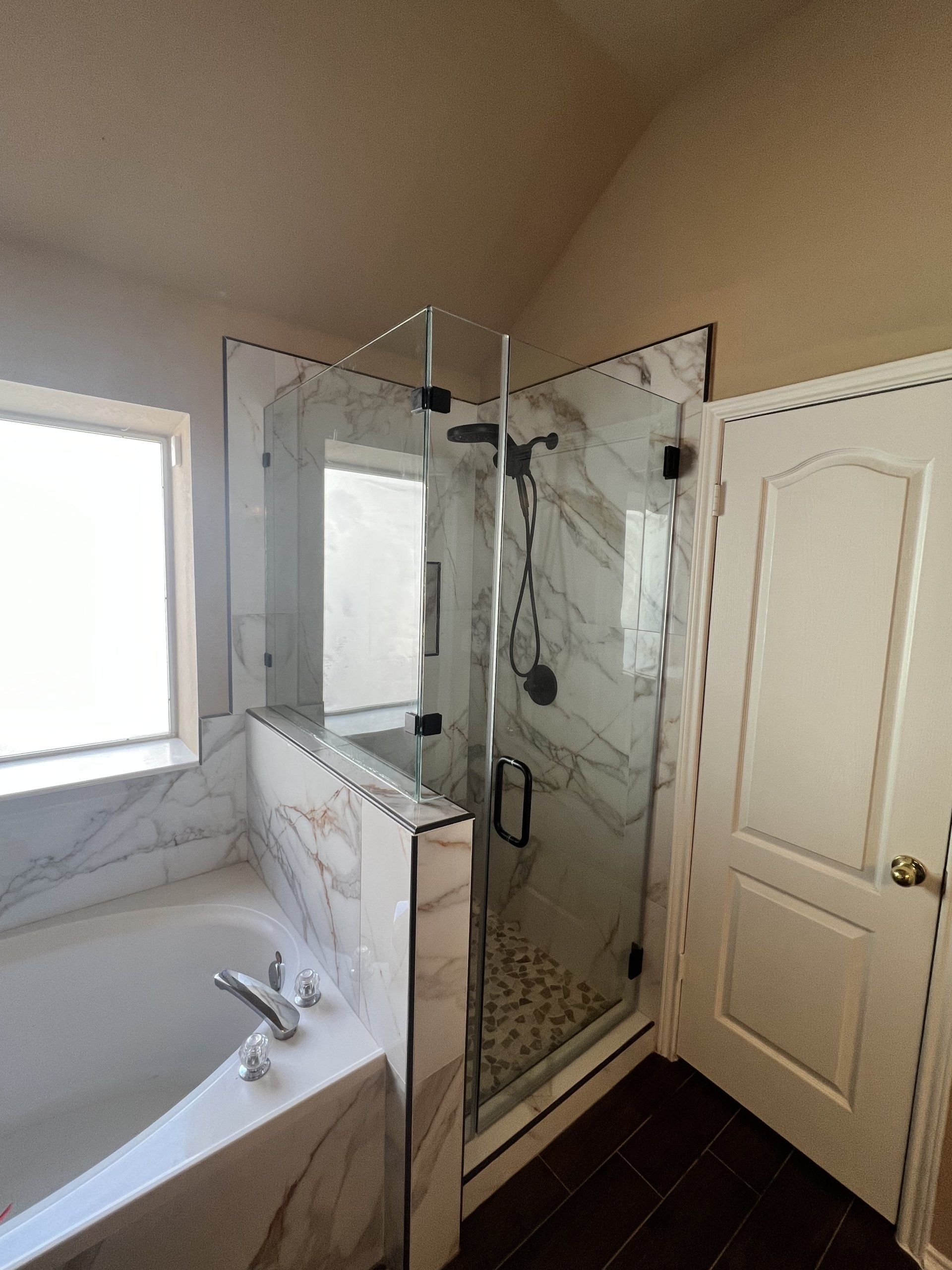 CUSTOM DESIGN 90 DEGREE STYLE SHOWER ENCLOSURE WITHOUT TRANSOM GLASS ABOVE DOOR FOR VENTILATION PER CUSTOMER REQUEST. BRUSH NICKEL FINISH HARDWARE ON CLEAR GLASS. KNOB STYLE HANDLE.