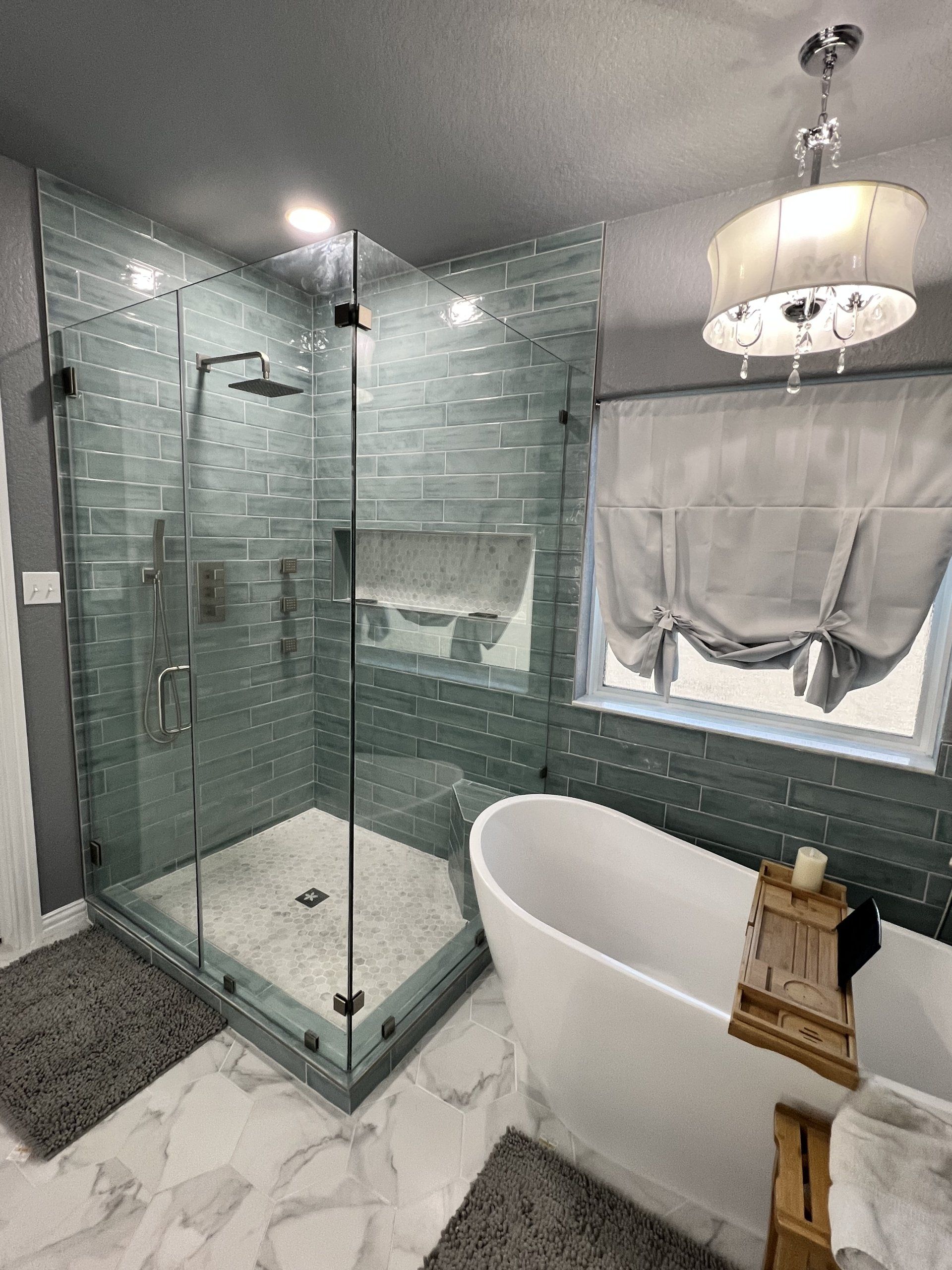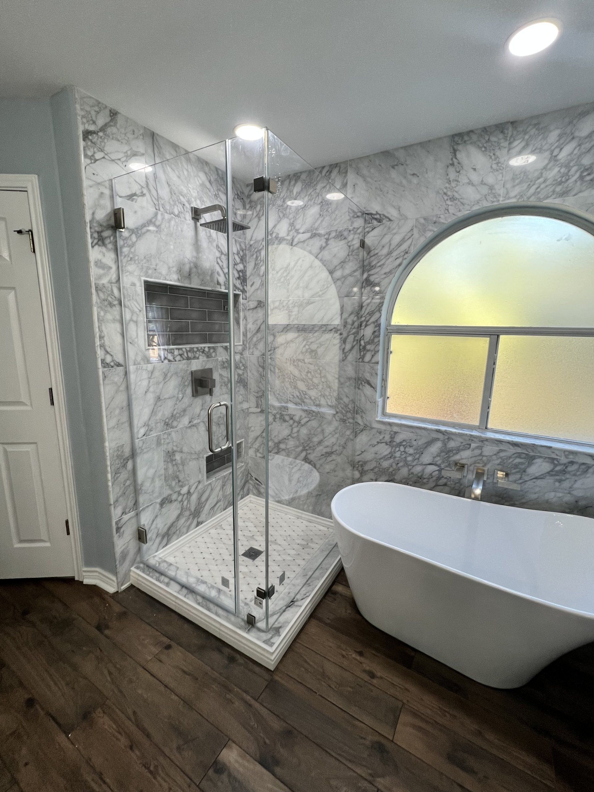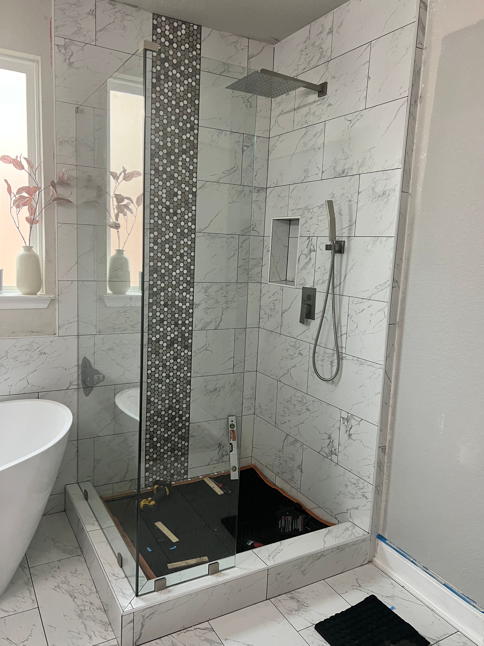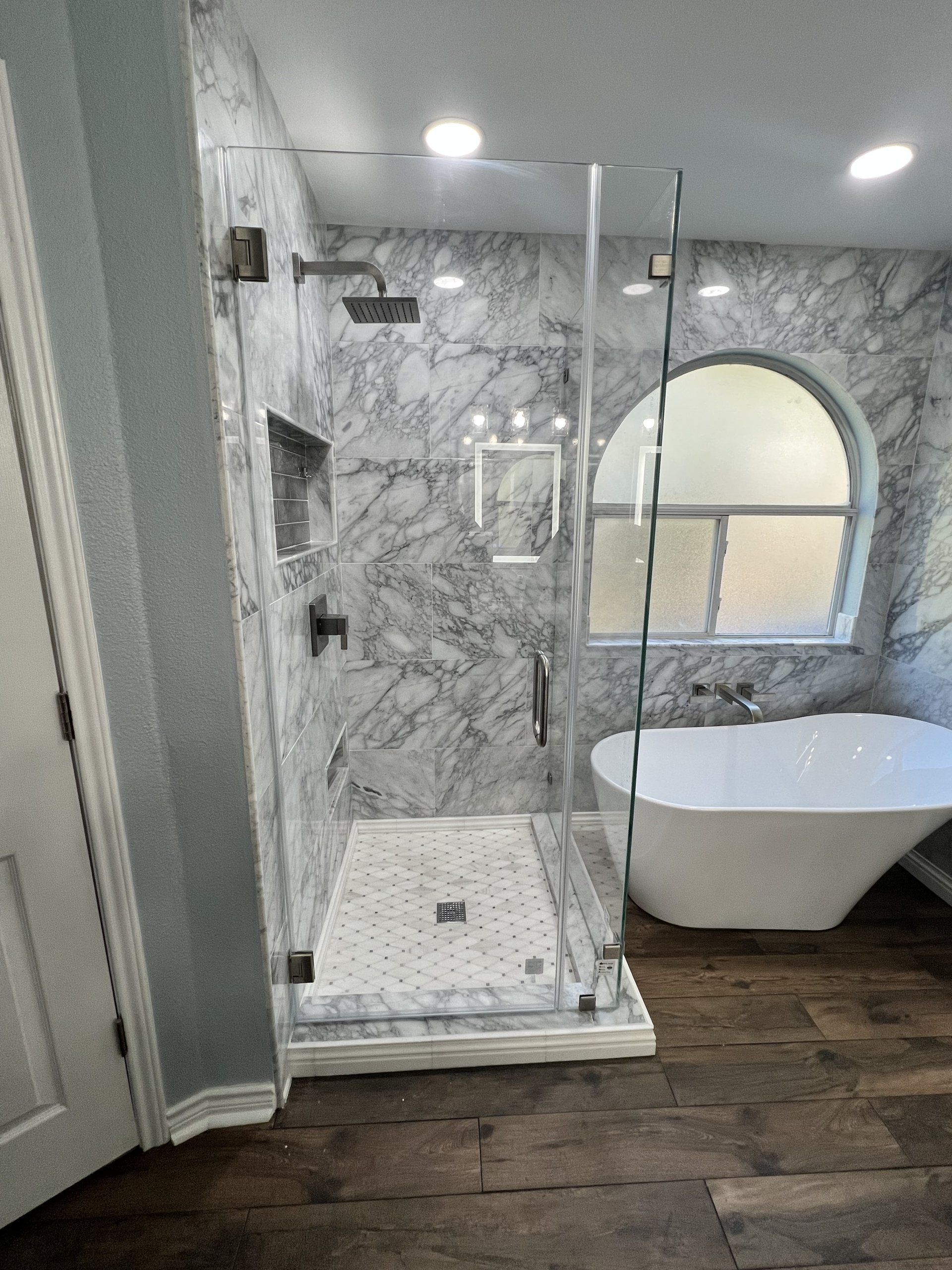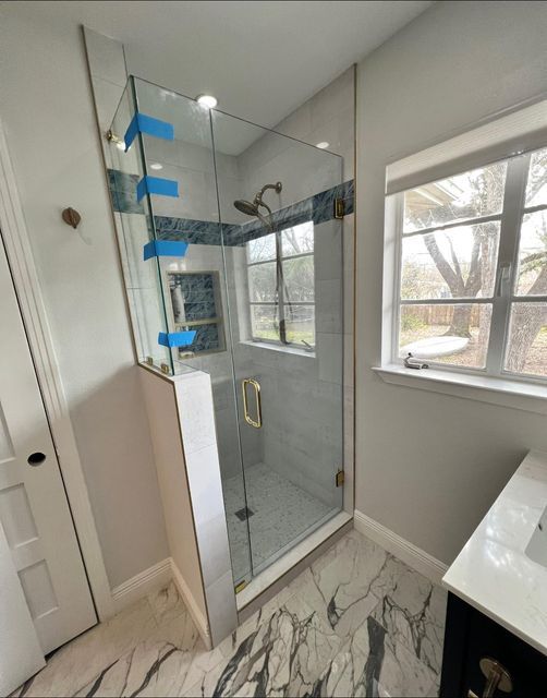 CUSTOM DESIGN 90 DEGREE STYLE SHOWER ENCLOSURE WITHOUT TRANSOM GLASS ABOVE DOOR FOR VENTILATION PER CUSTOMER REQUEST. BRUSH NICKEL FINISH HARDWARE ON CLEAR GLASS. KNOB STYLE HANDLE.