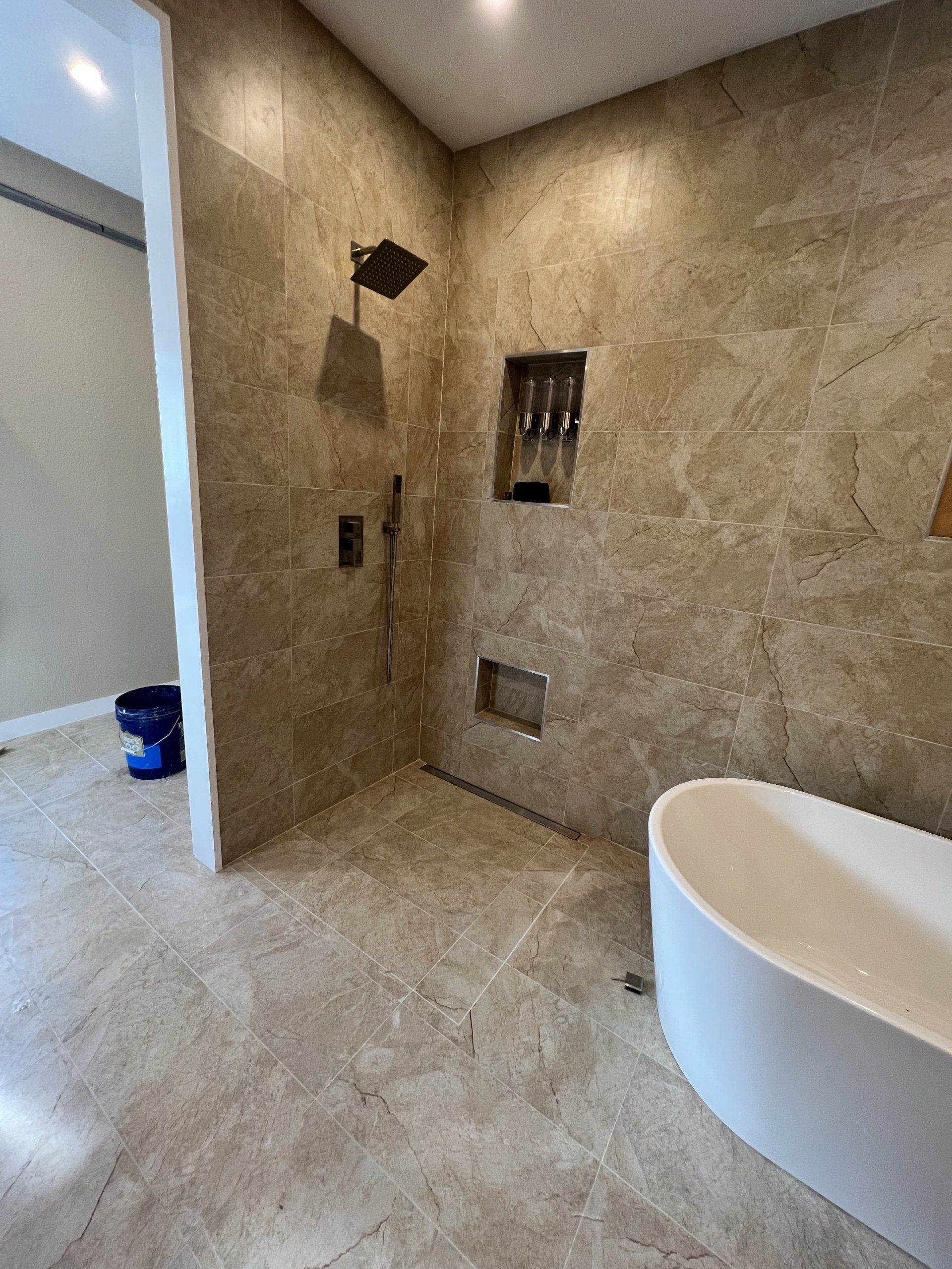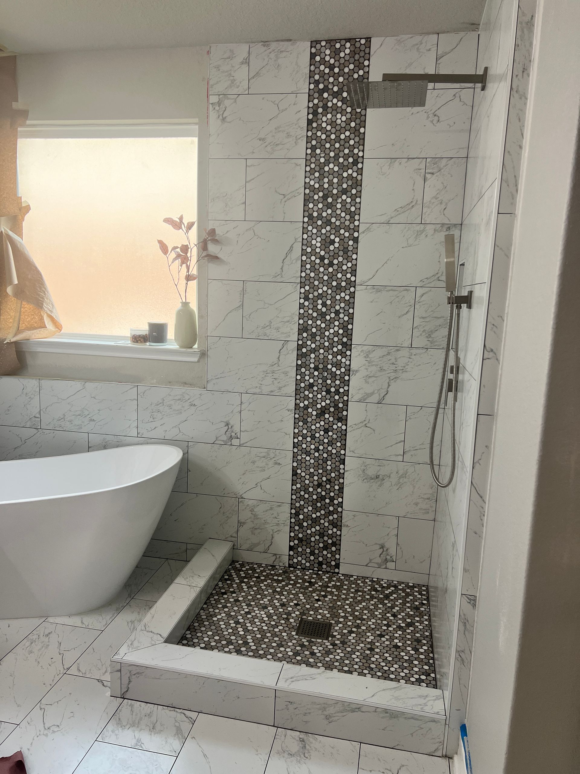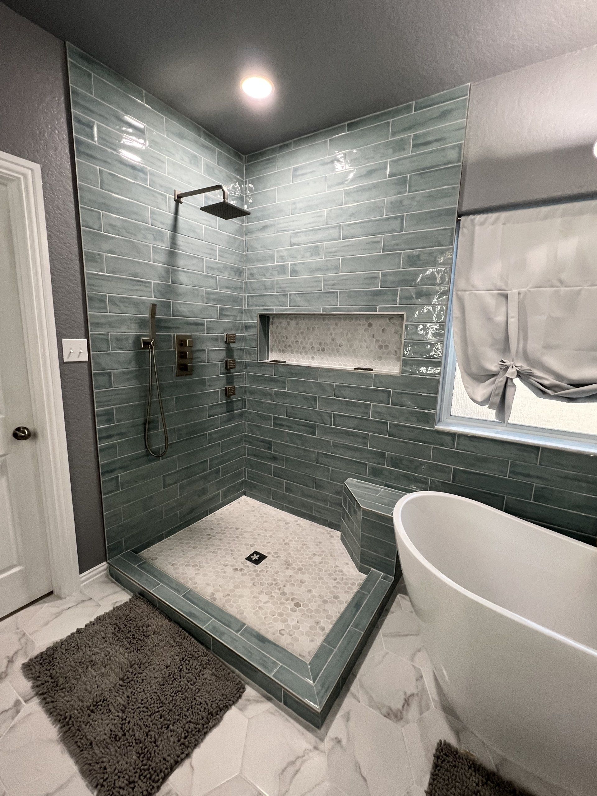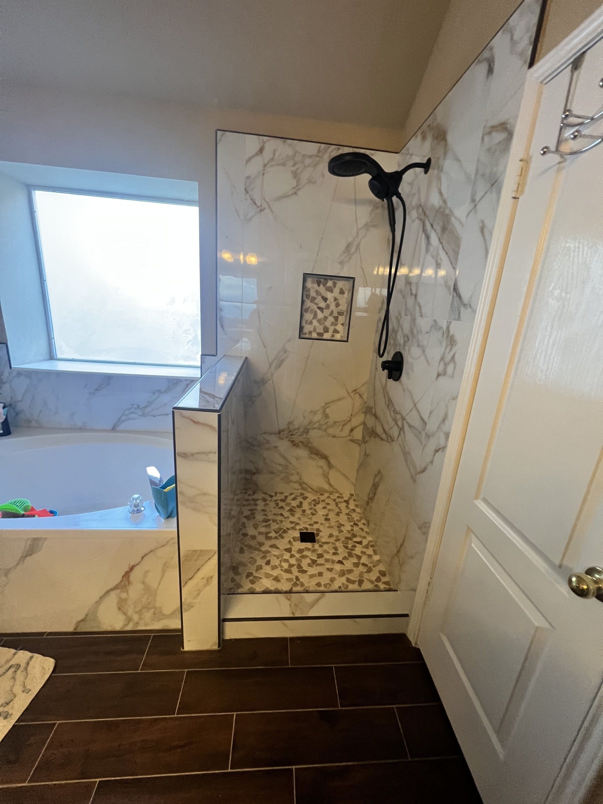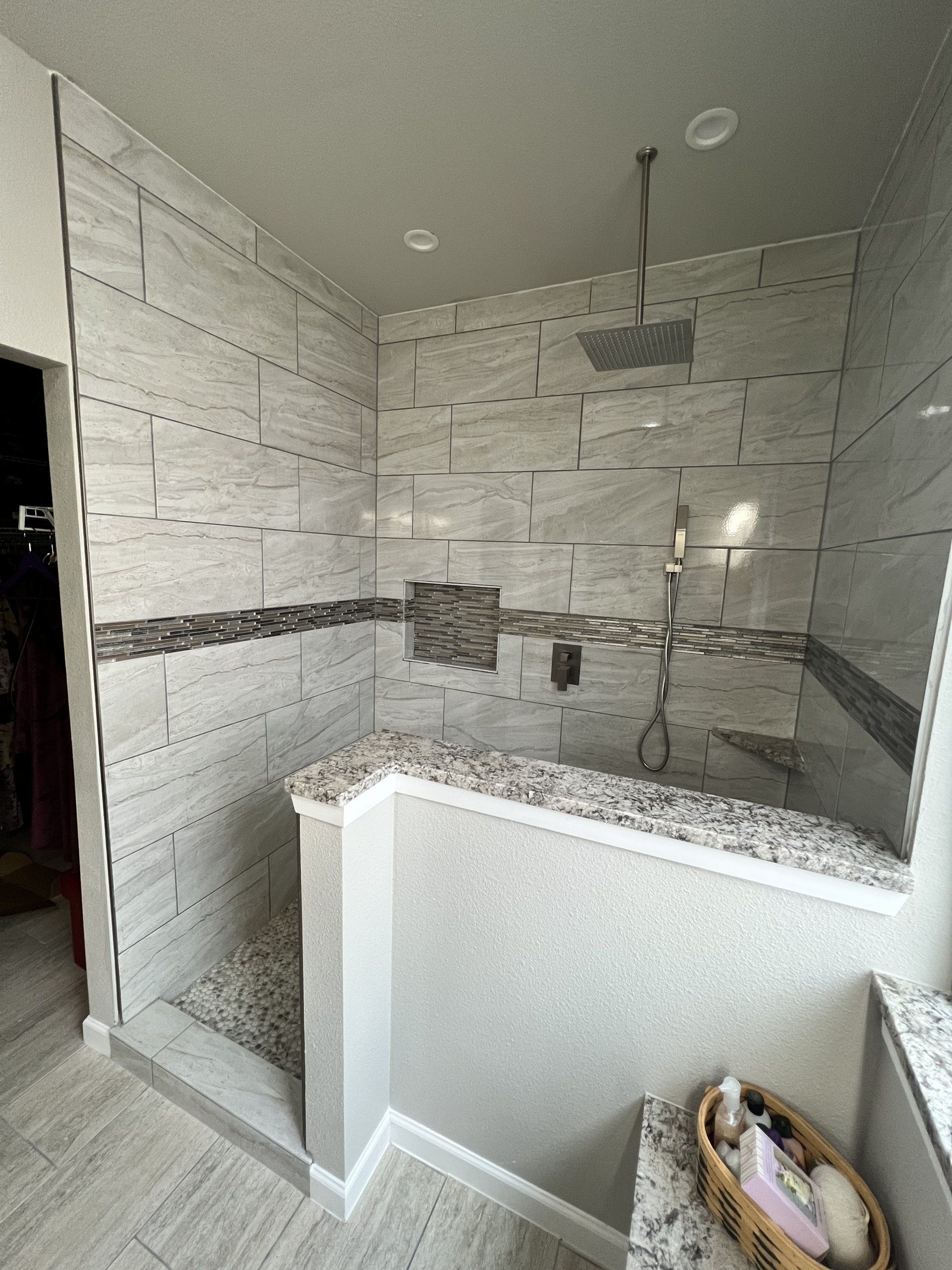 CUSTOM DESIGN 90 DEGREE STYLE SHOWER ENCLOSURE WITHOUT TRANSOM GLASS ABOVE DOOR FOR VENTILATION PER CUSTOMER REQUEST. BRUSH NICKEL FINISH HARDWARE ON CLEAR GLASS. KNOB STYLE HANDLE.