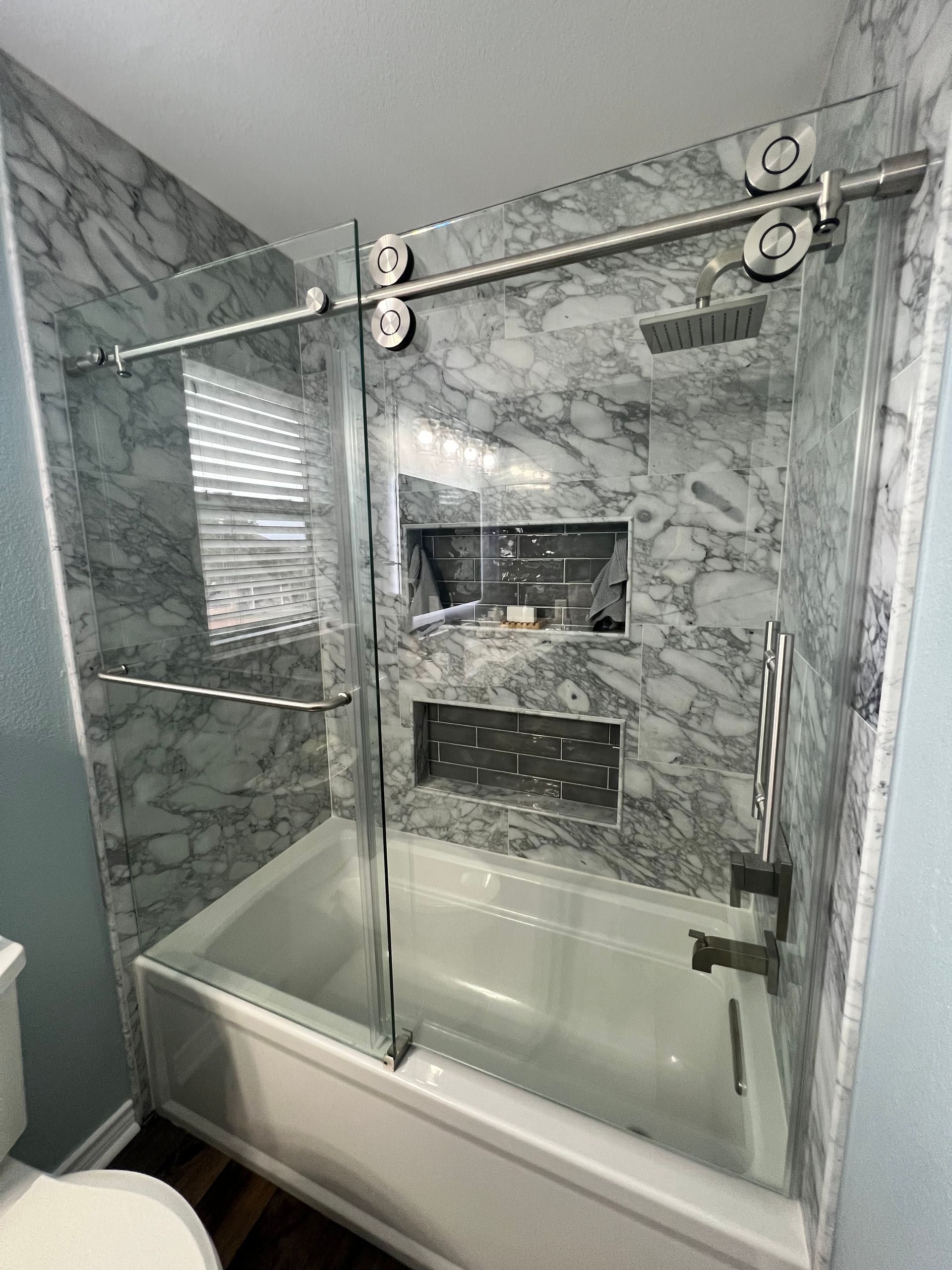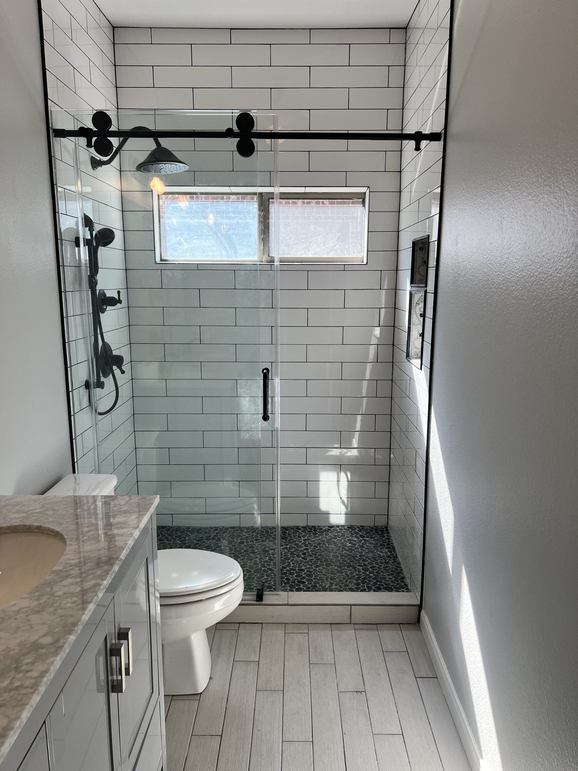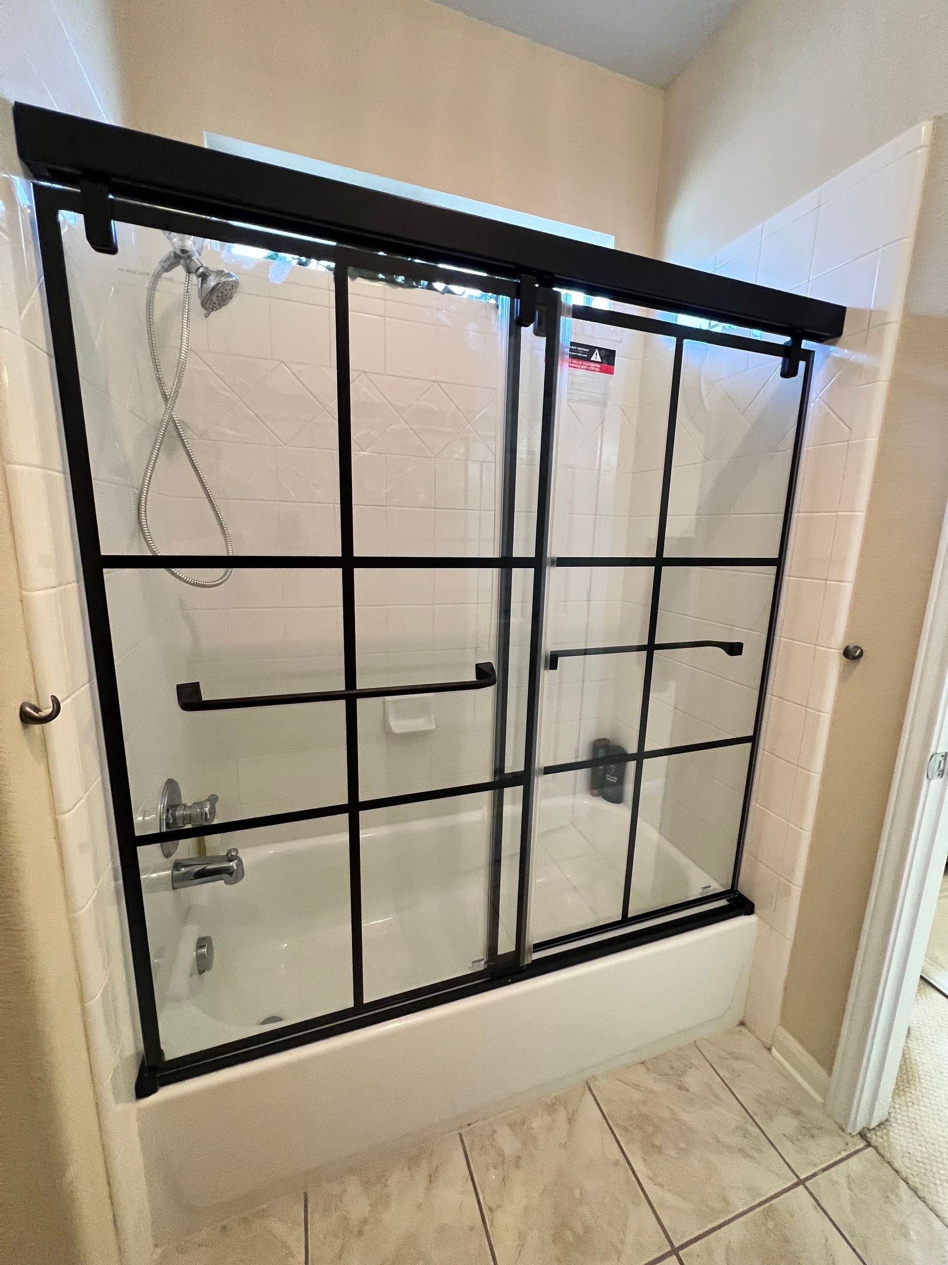 GRID STYLE BARN DOOR SLIDING DOORS. CLEAR TEMPERED GLASS WITH BLACK FINISH FRAMING AND GRIDSTYLE.