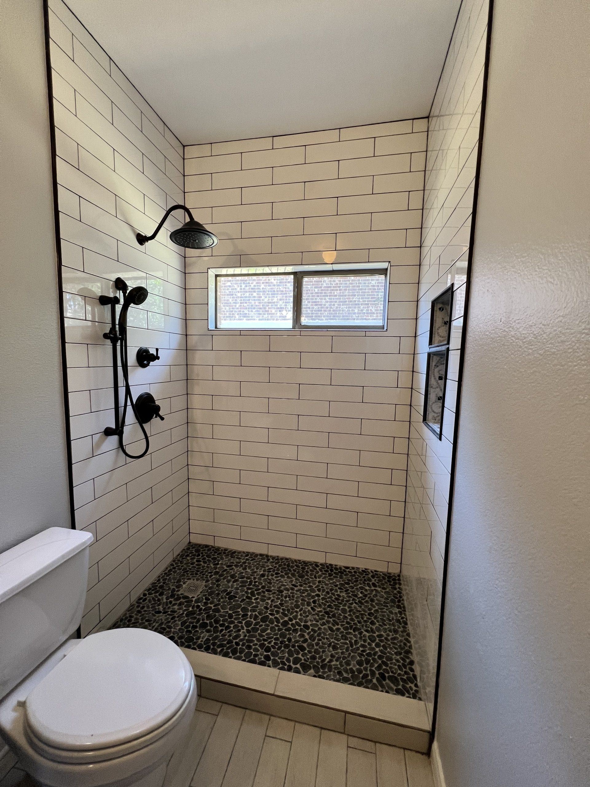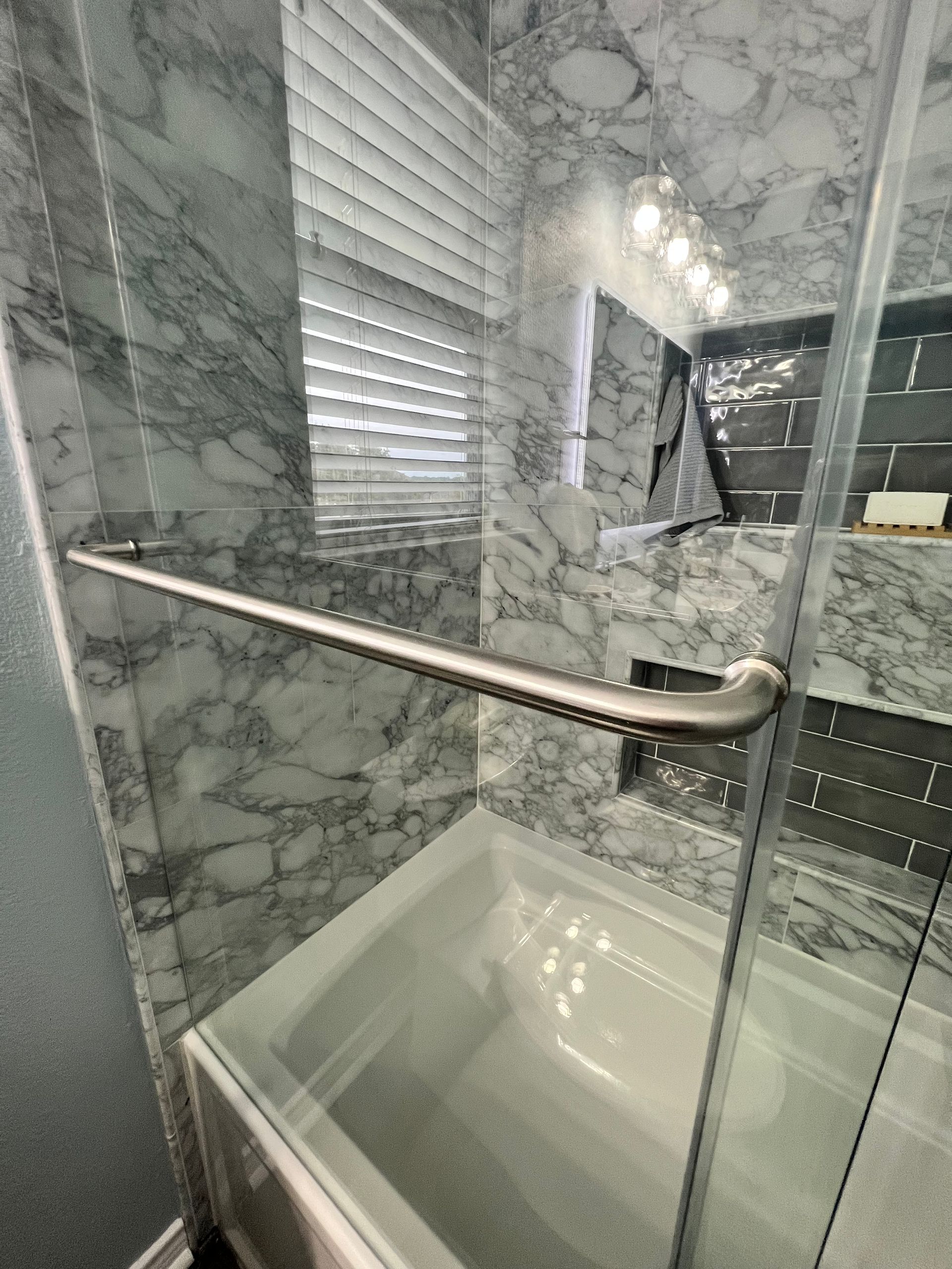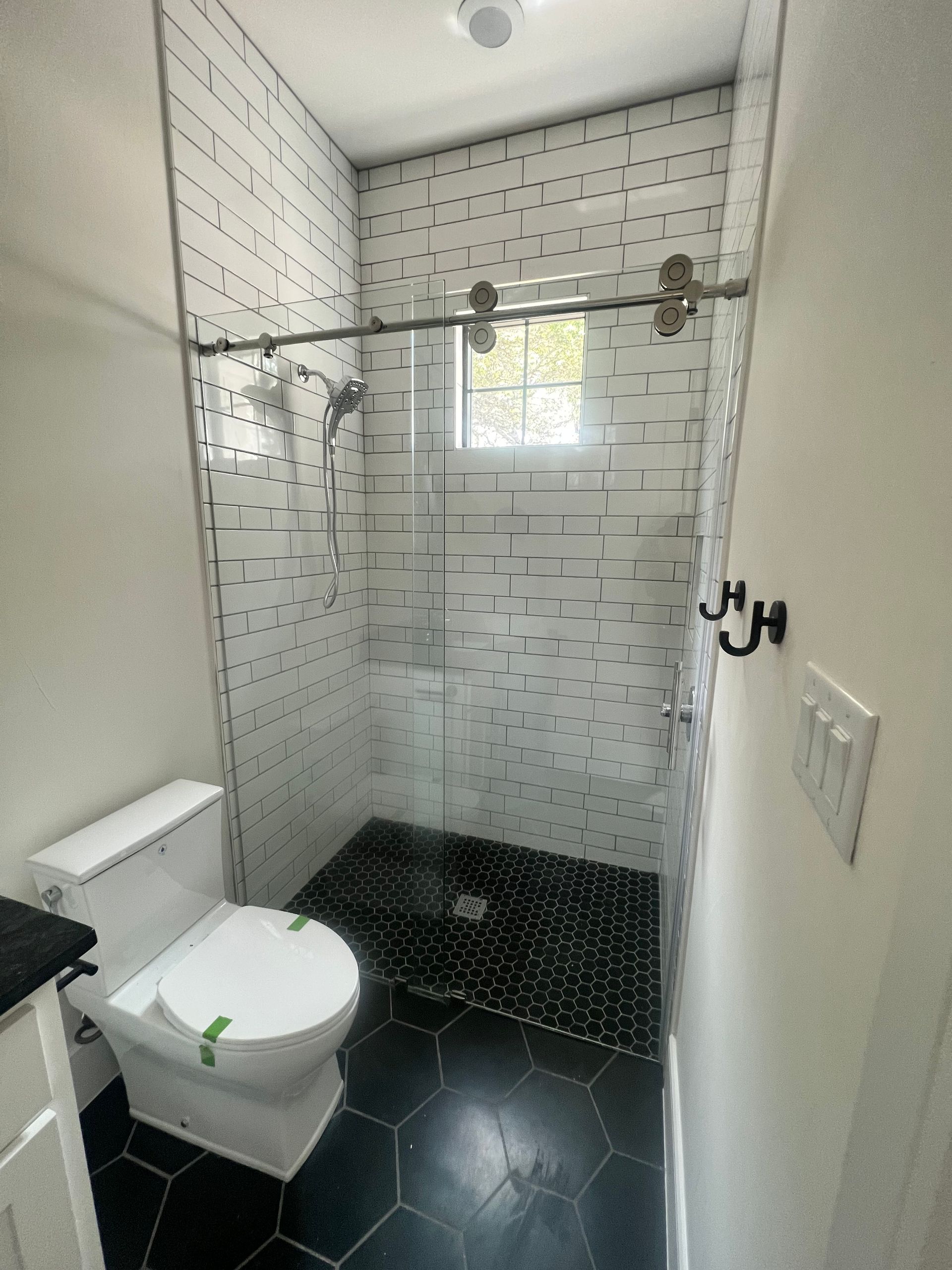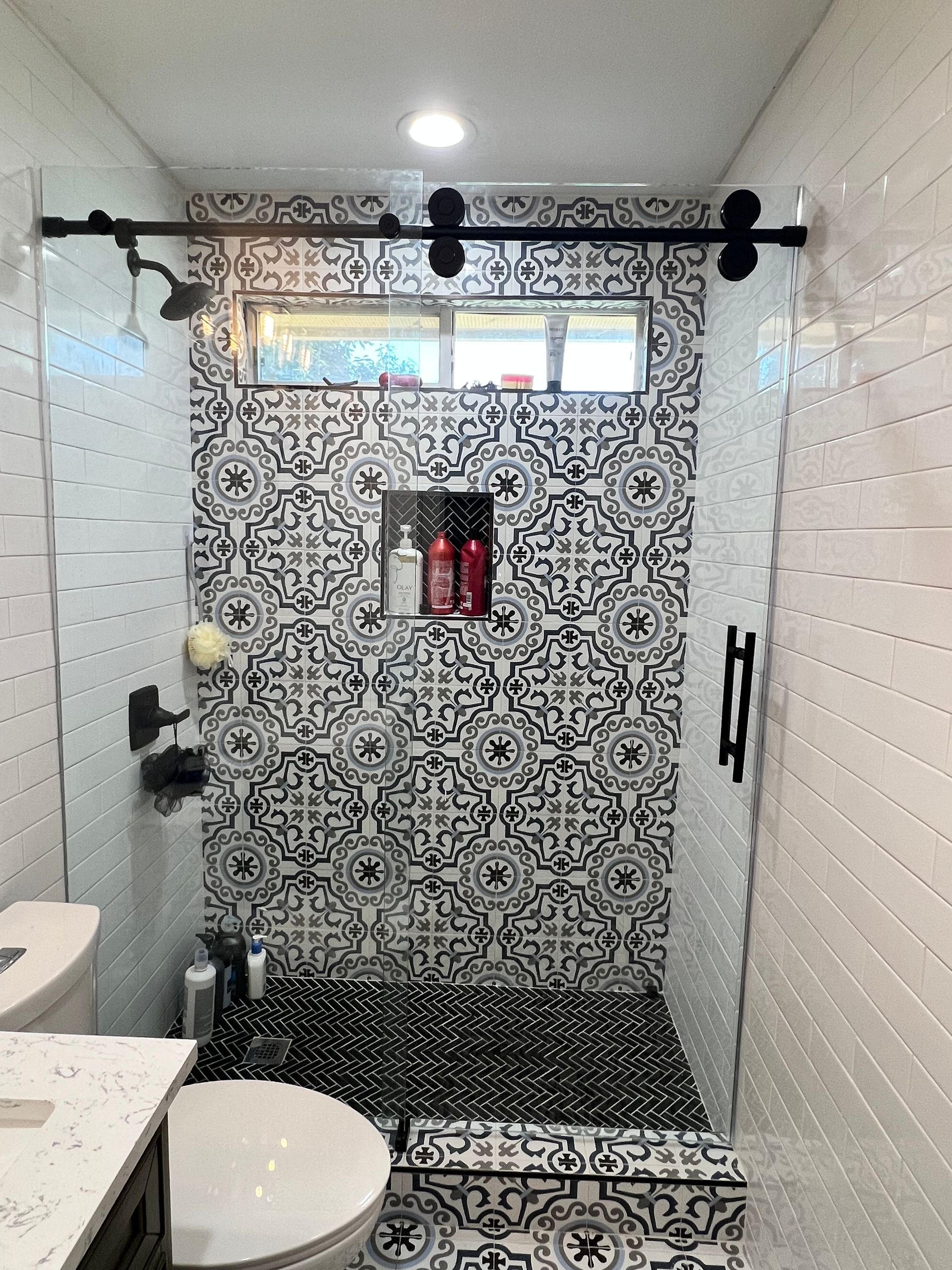 GRID STYLE BARN DOOR SLIDING DOORS. CLEAR TEMPERED GLASS WITH BLACK FINISH FRAMING AND GRIDSTYLE.