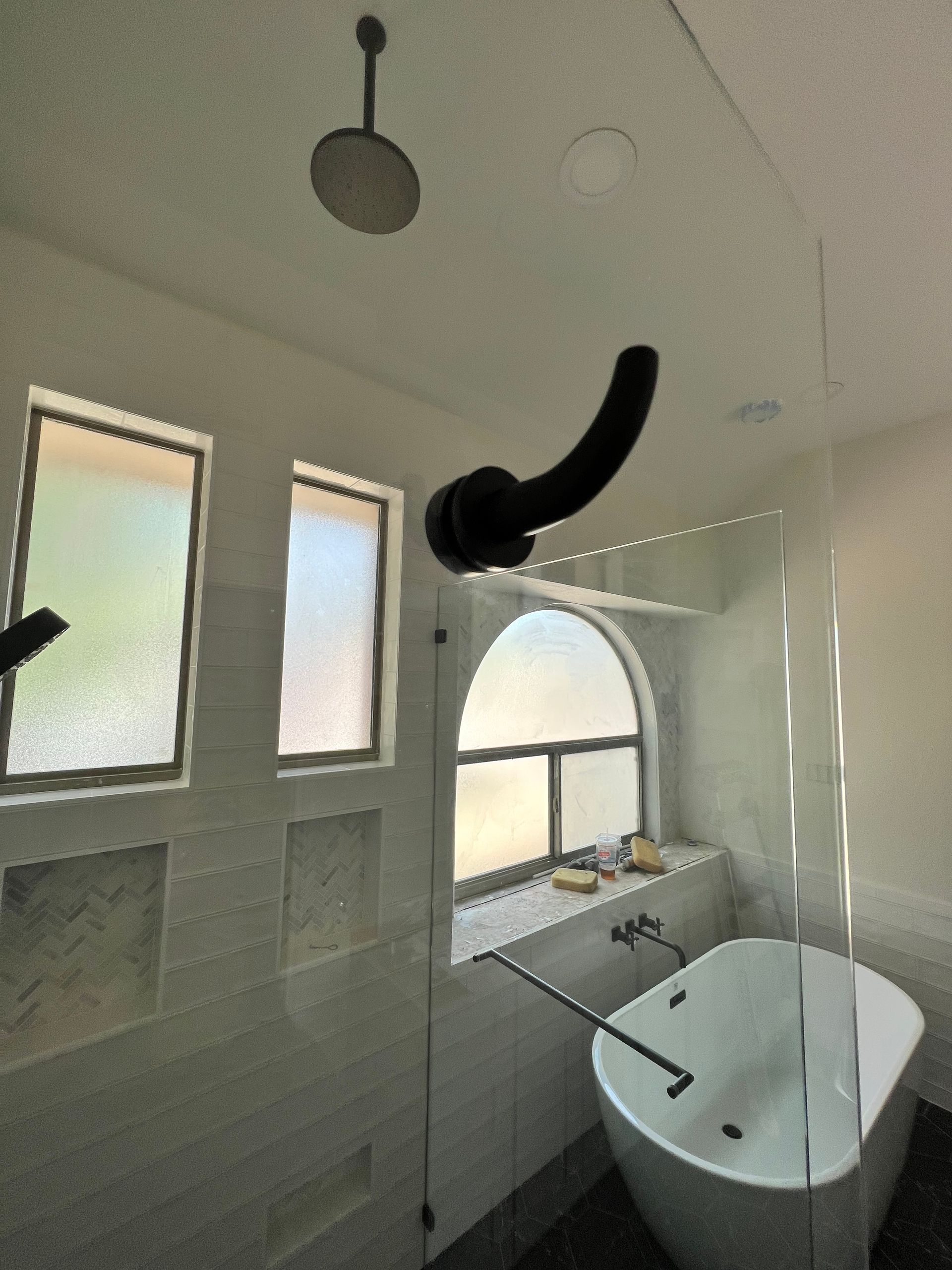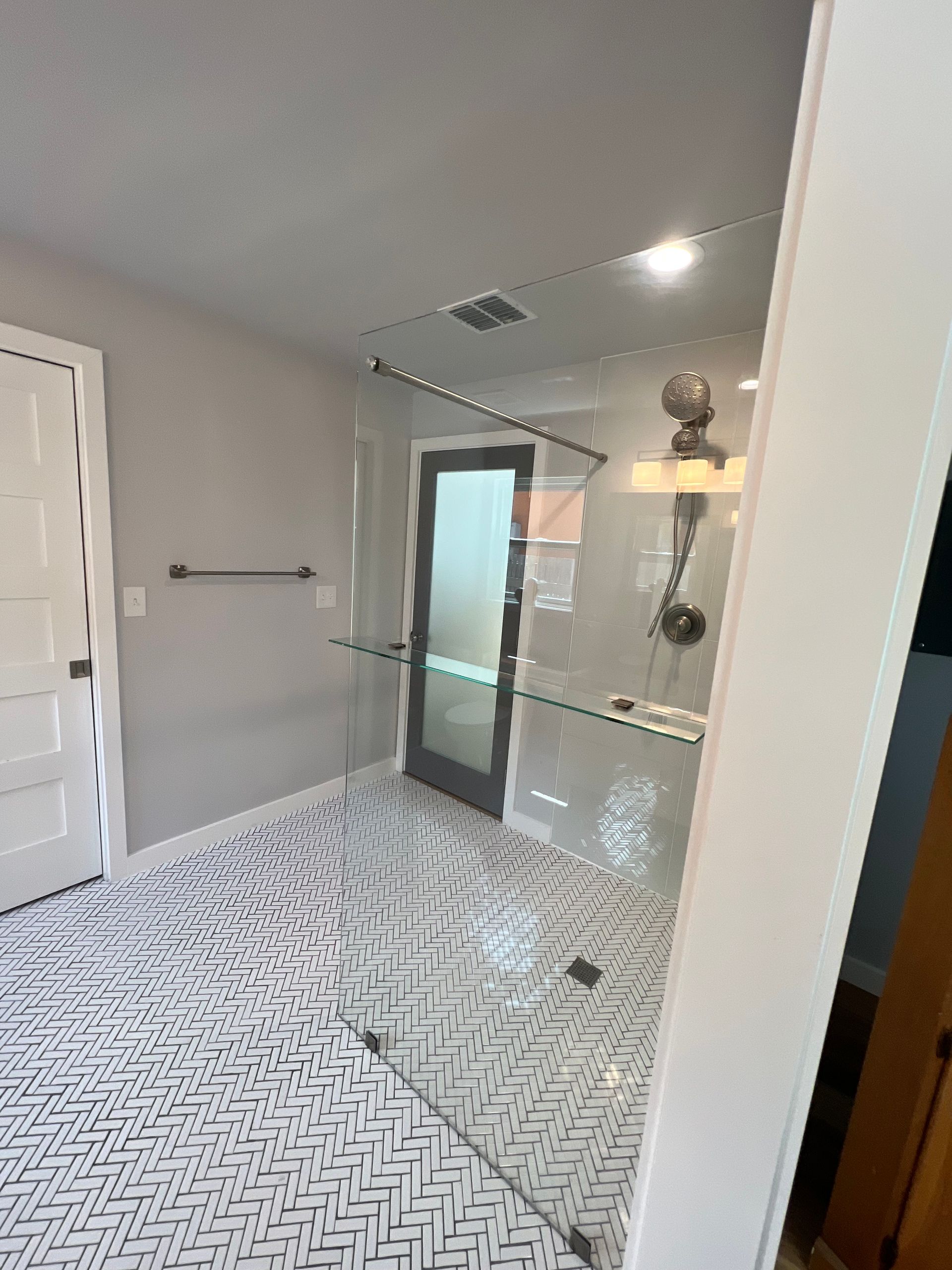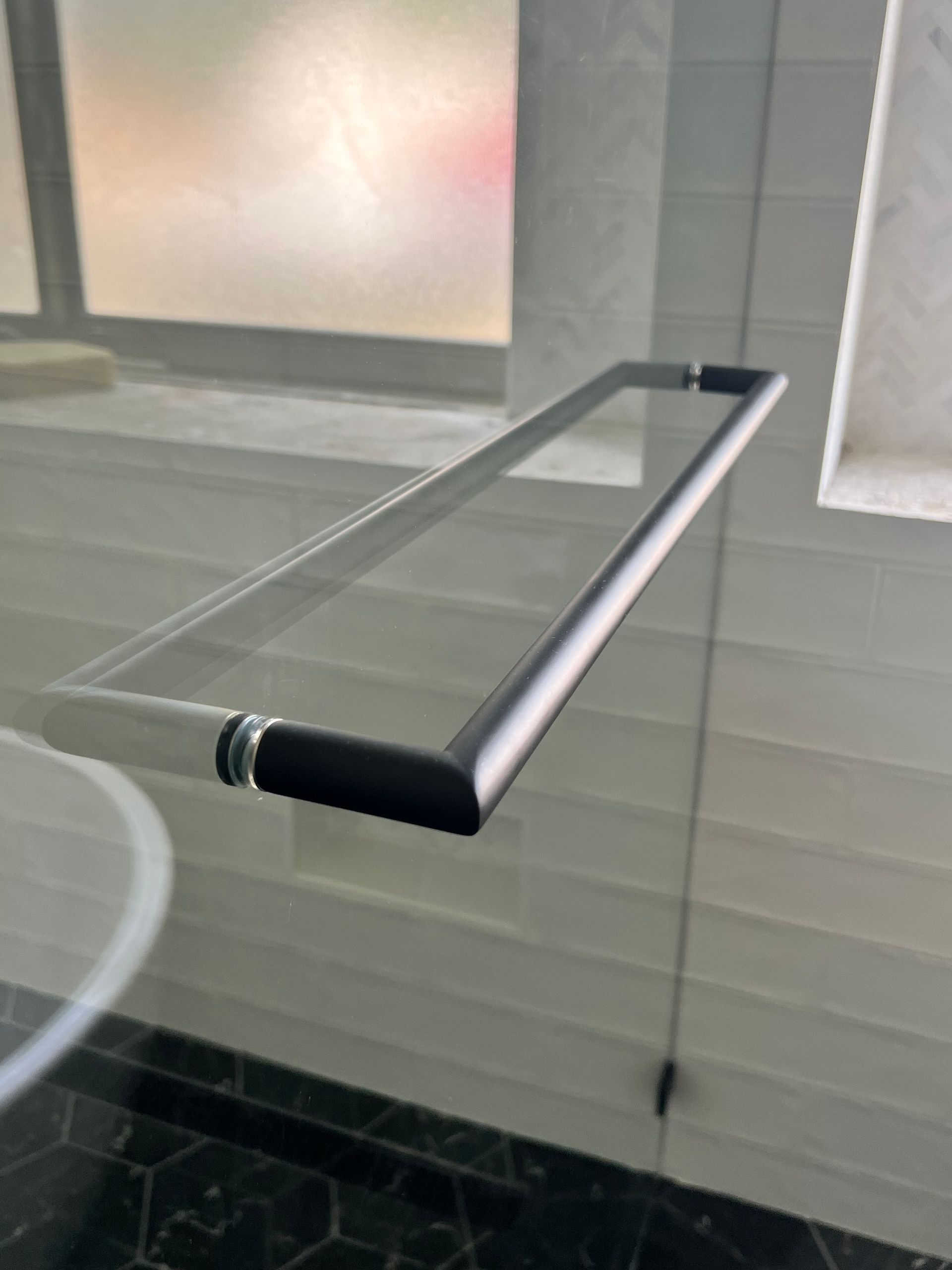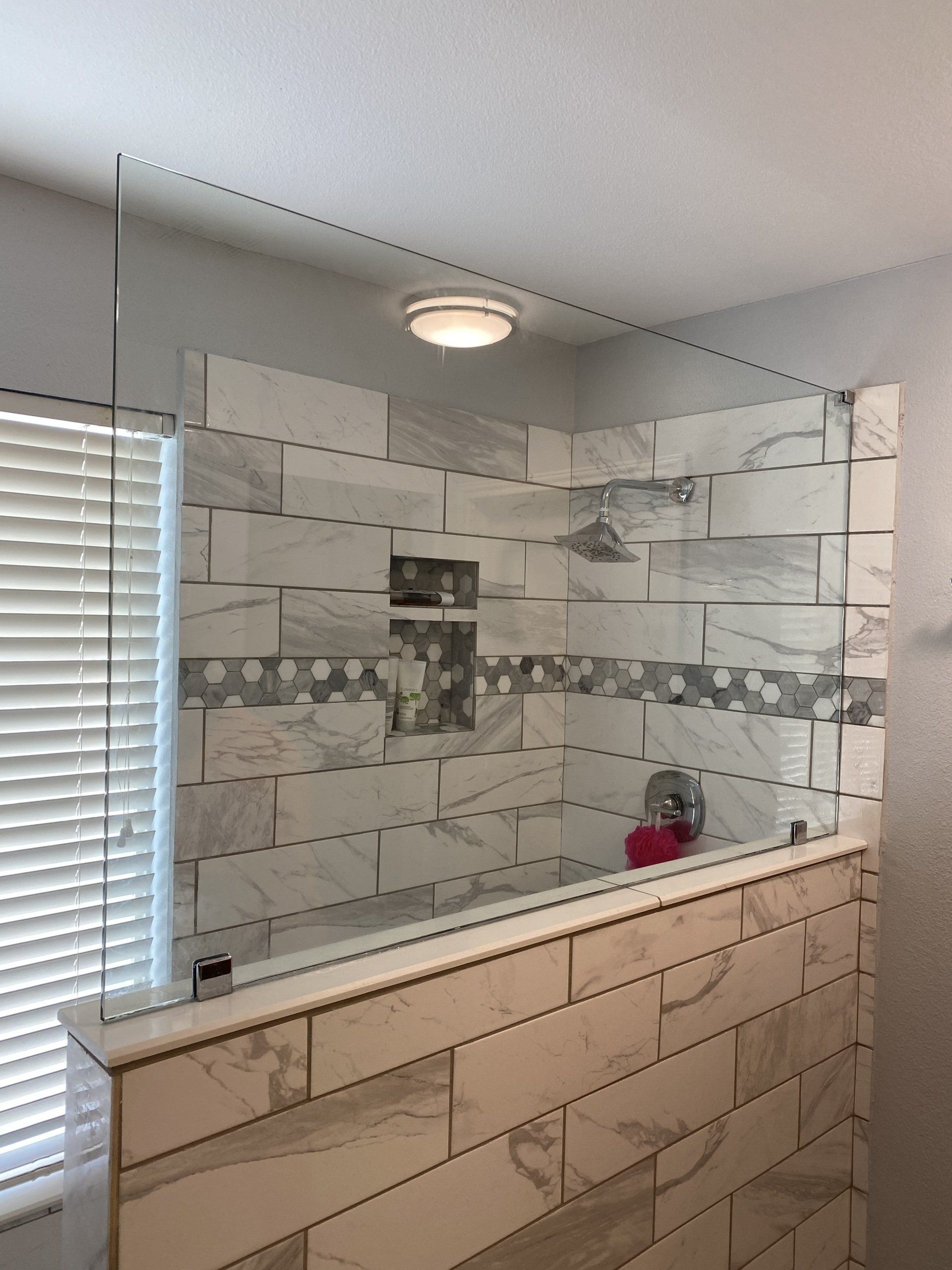FRAMELESS FIXED PANEL WITH CURTAIN ROD / SUPPORT BAR FOR WHEEL CHAIR ENTRY AND GLASS SHELF ATTACHED TO OUTER GLASS WALL