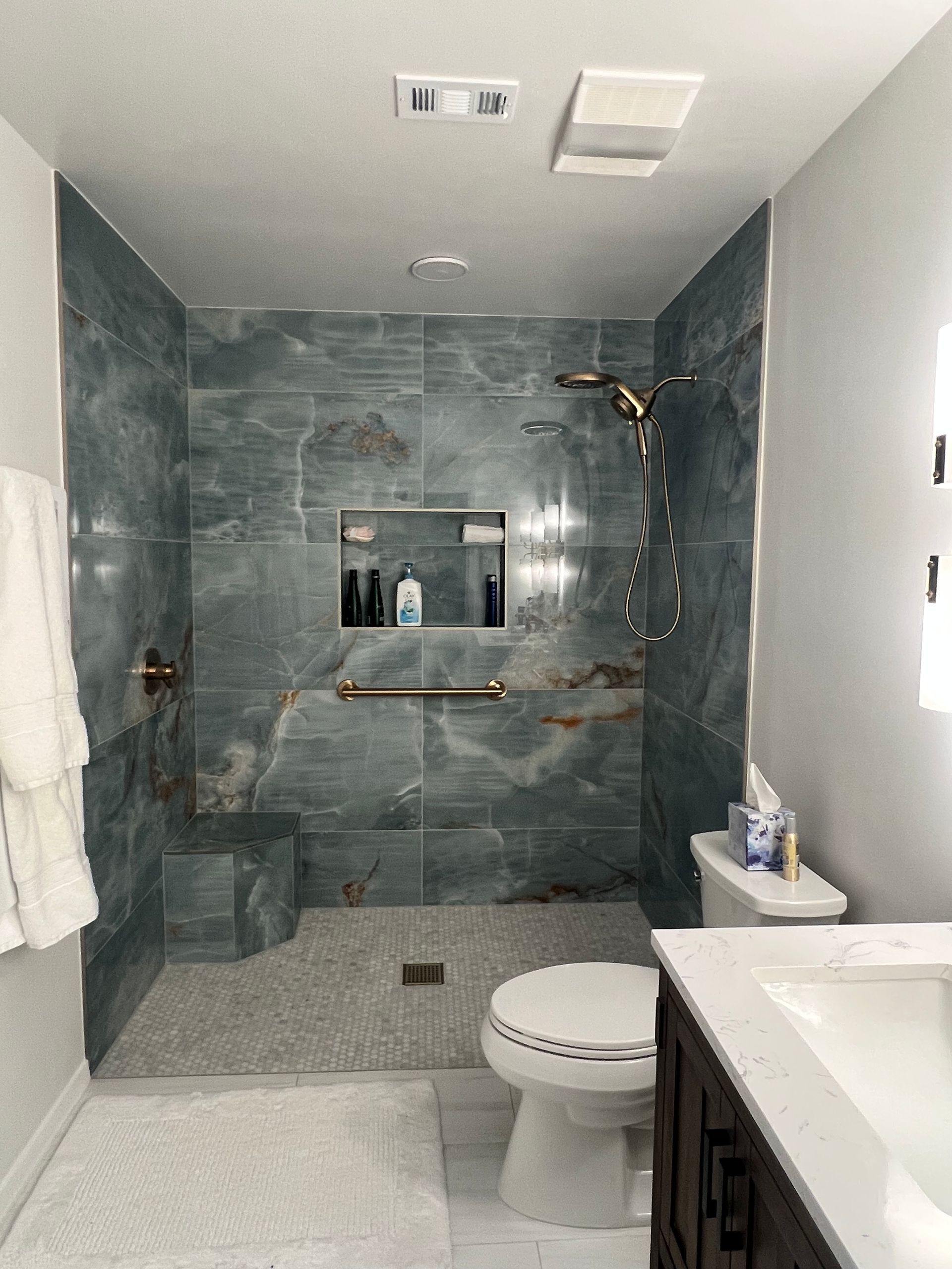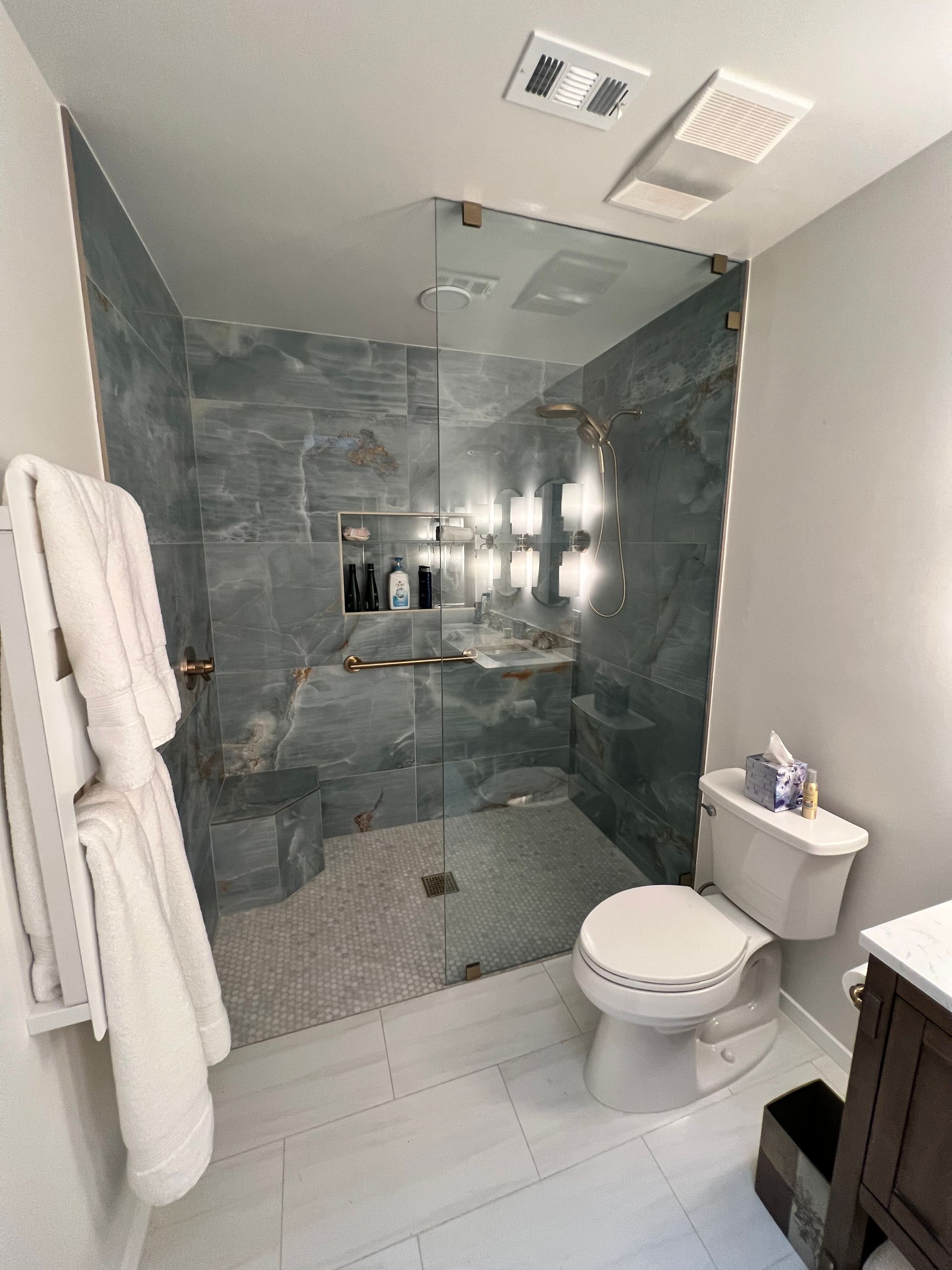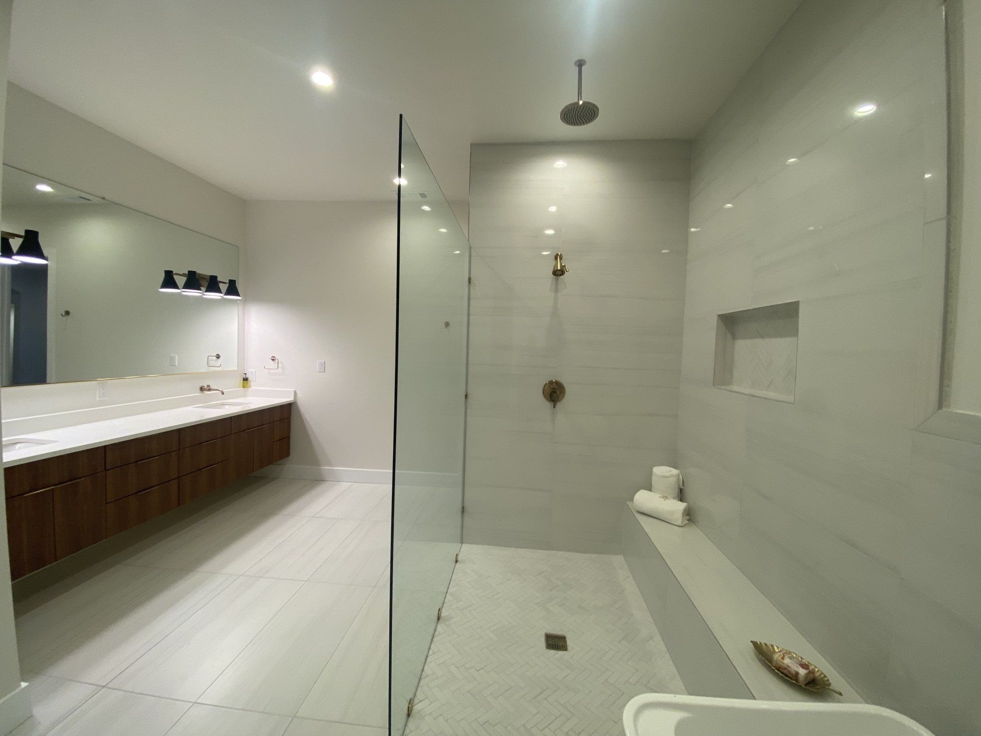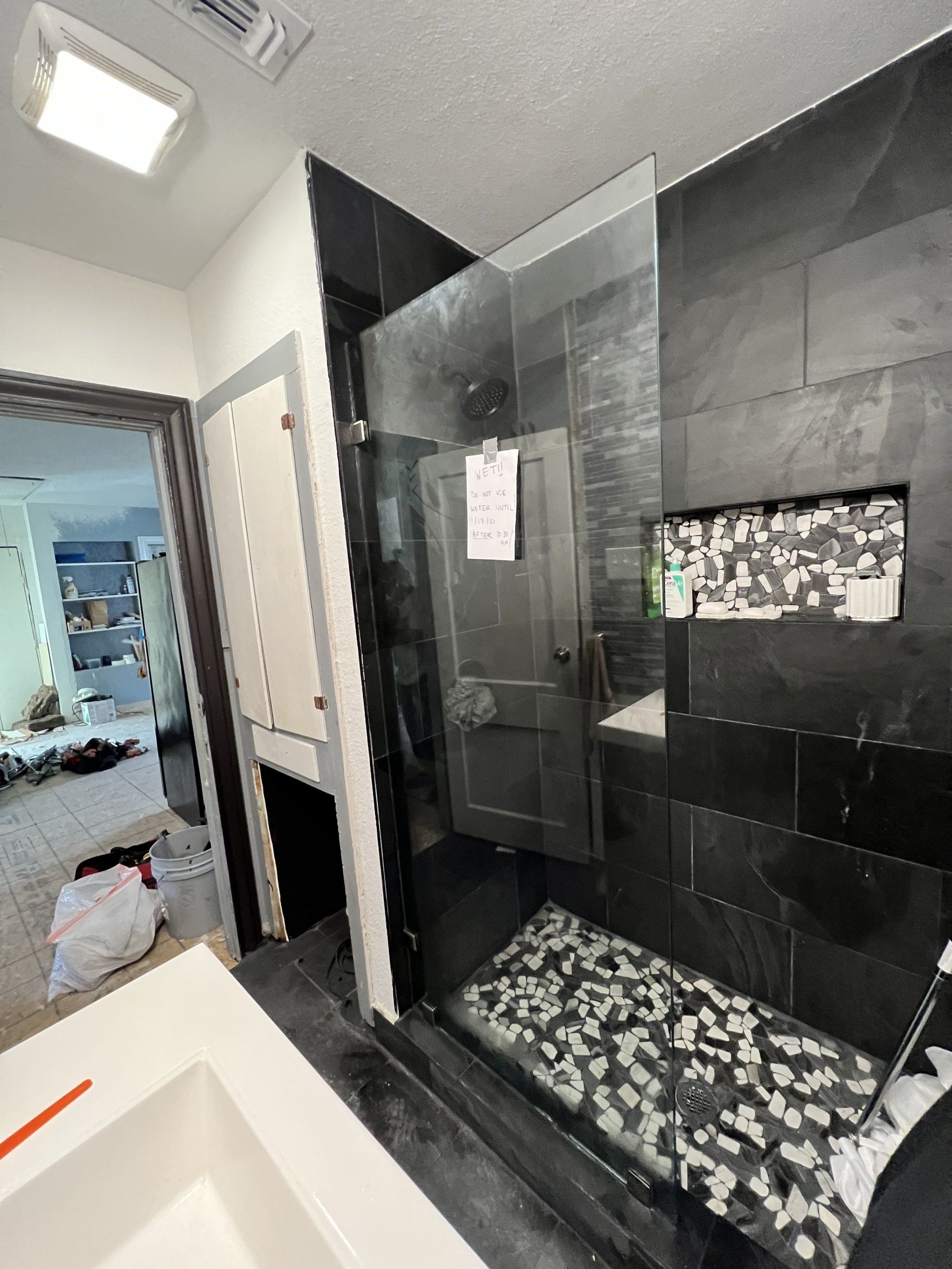 FRAMELESS FIXED PANEL WITH CURTAIN ROD / SUPPORT BAR FOR WHEEL CHAIR ENTRY AND GLASS SHELF ATTACHED TO OUTER GLASS WALL