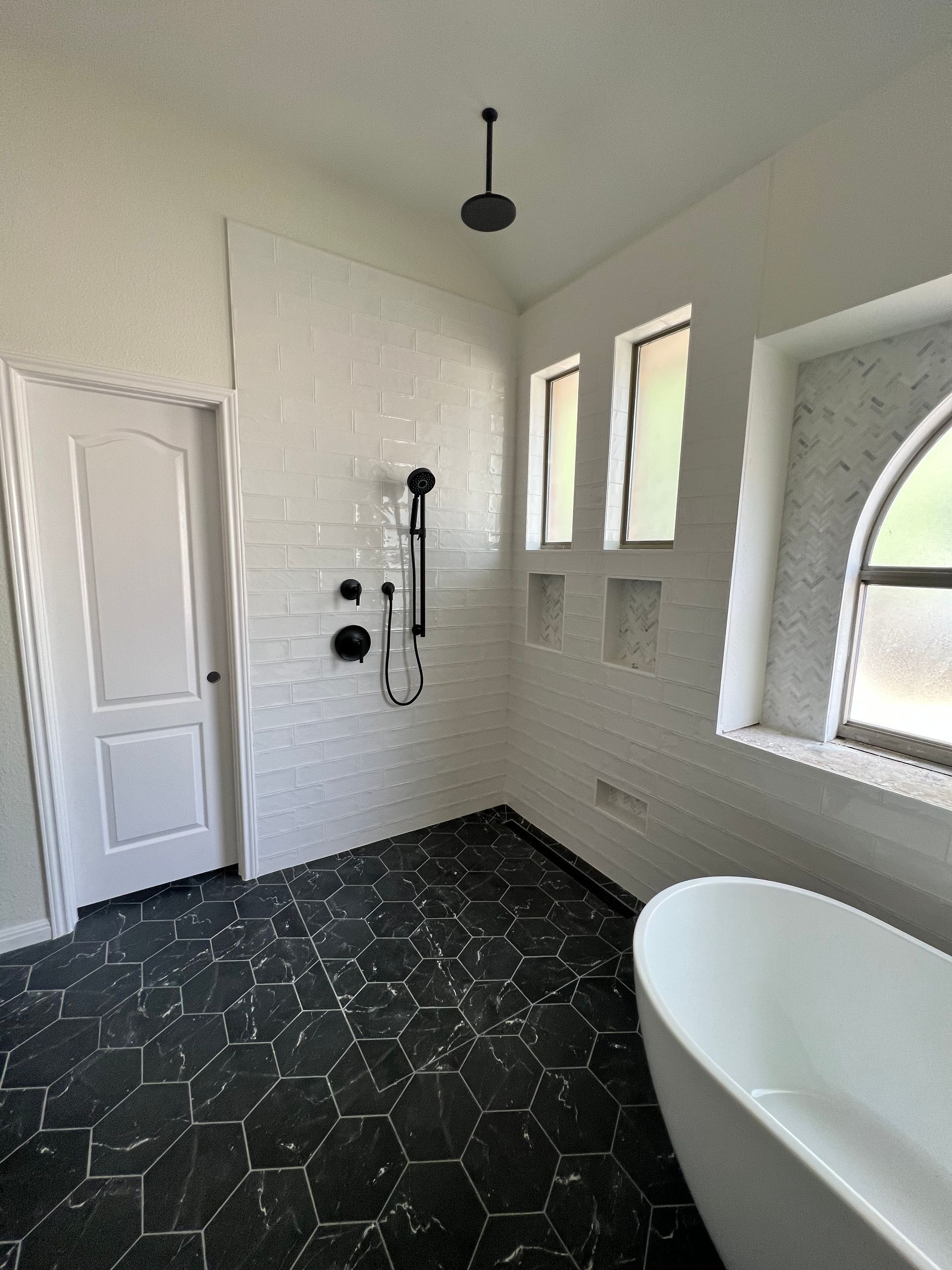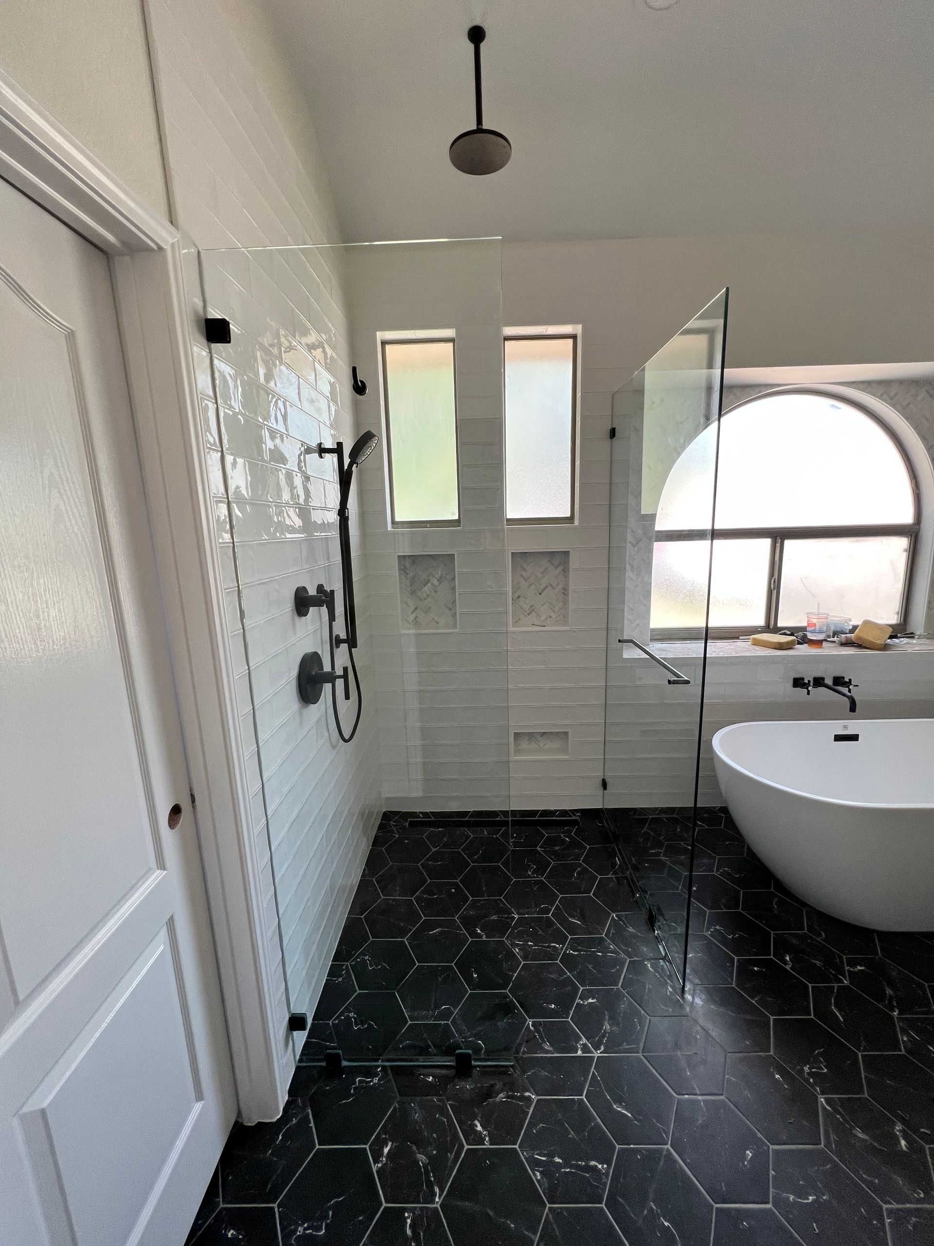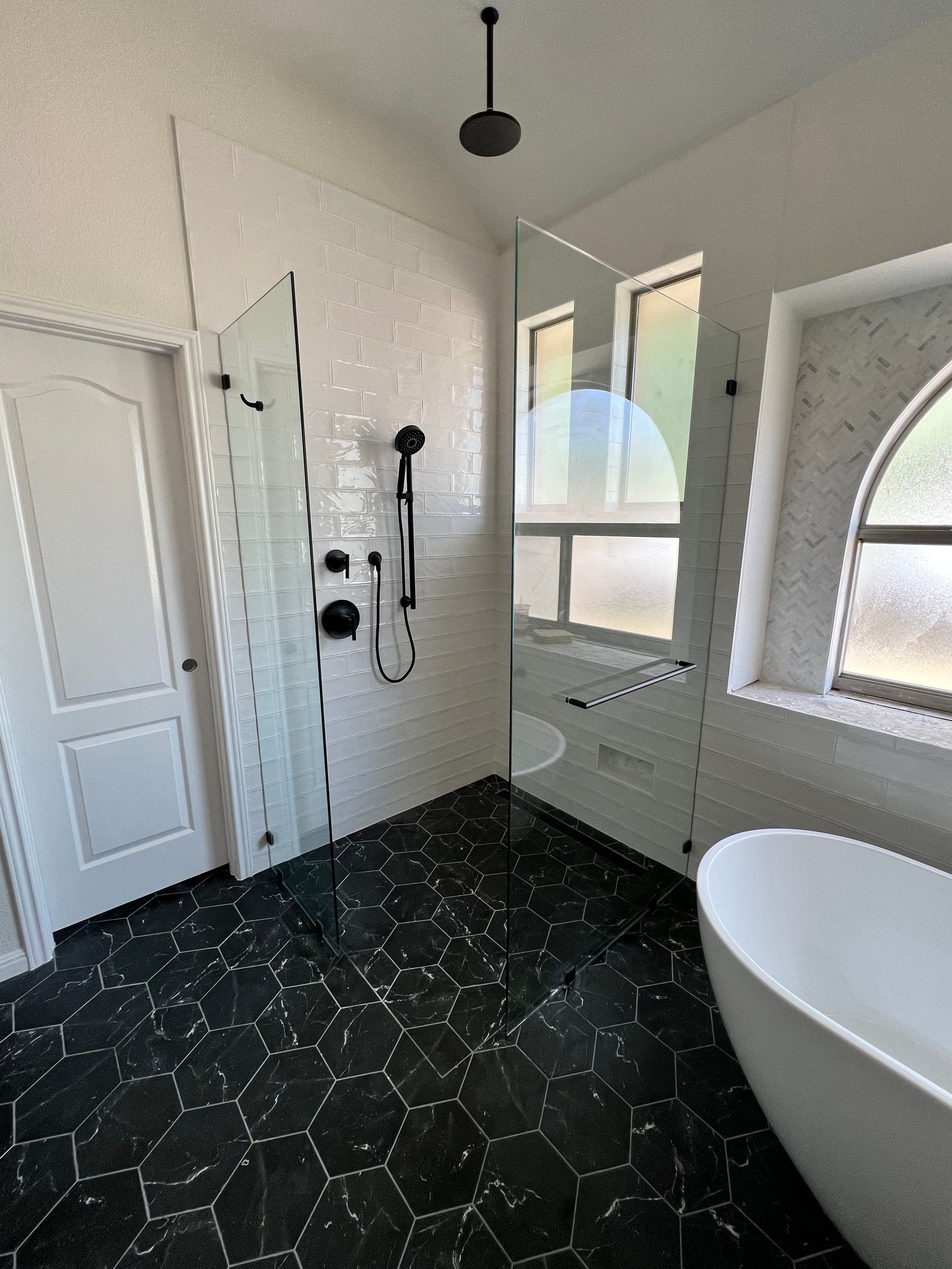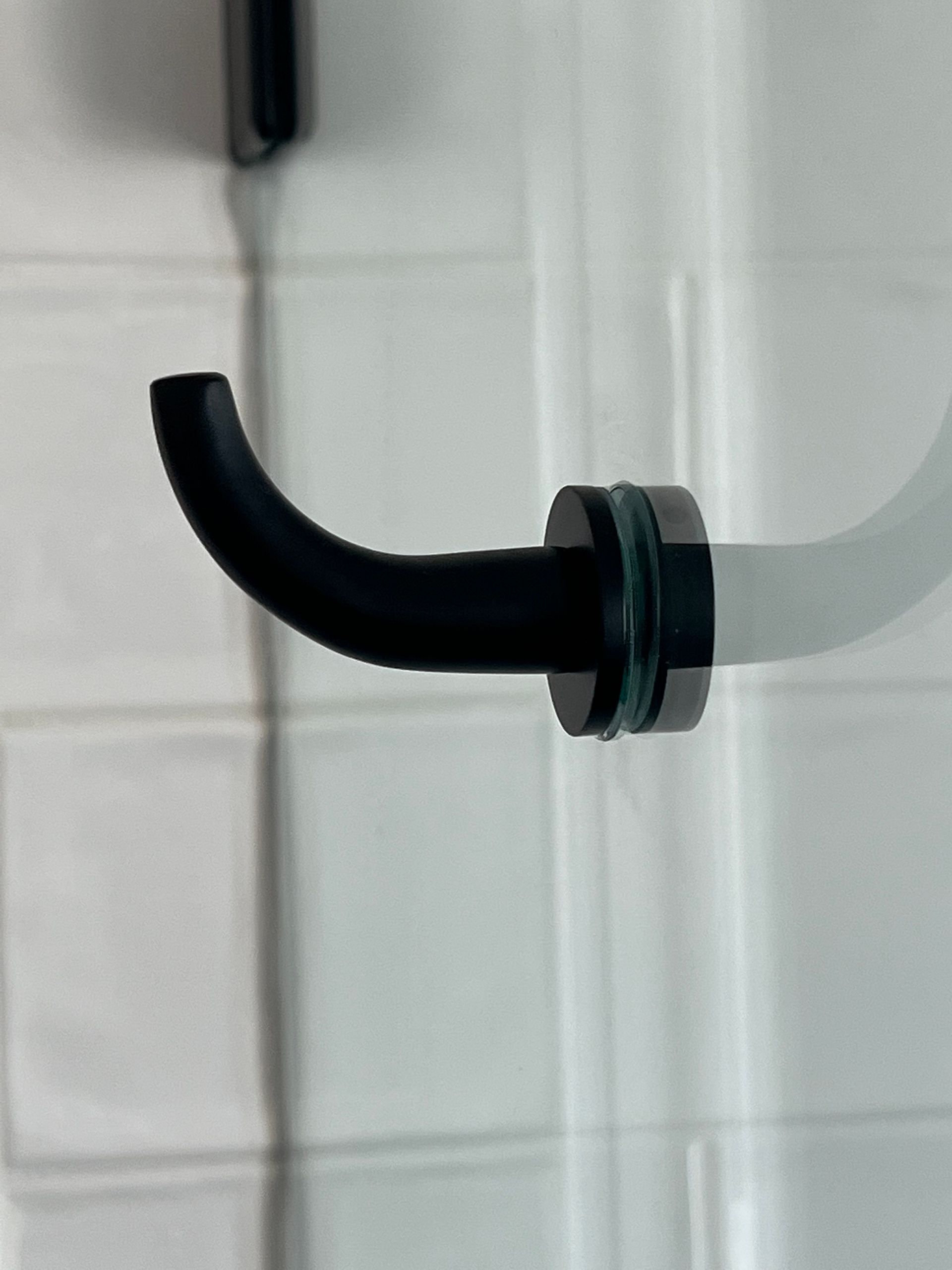 2 FIXED PANELS WITH OPEN WALK-IN STYLE ENTRANCE. TOWEL HOOK TOP LEFT PANEL FOR SHOWER, WITH TOWEL BAR OUTSIDE RIGHT PANEL FOR TUB TOWEL