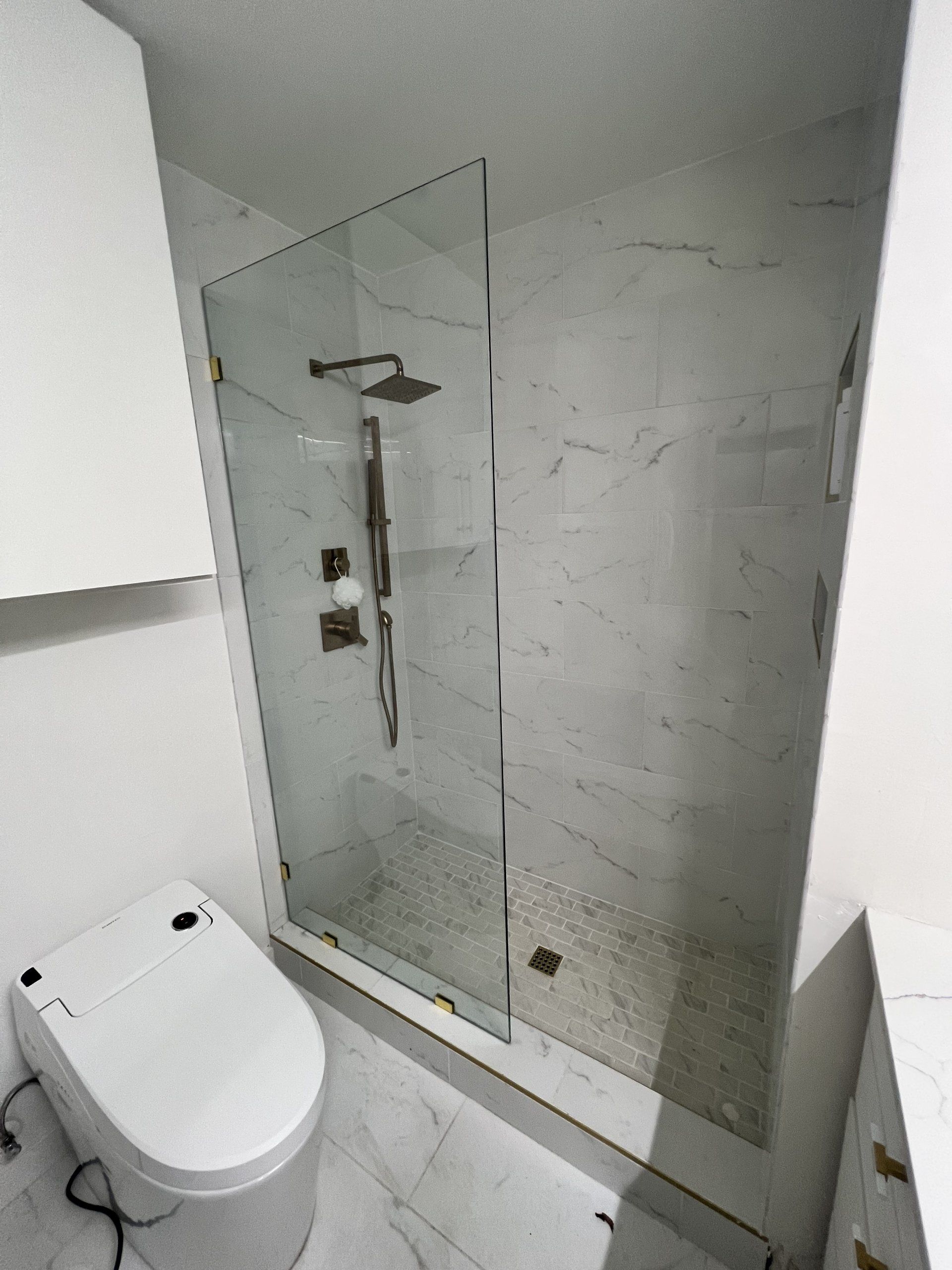 FLOOR TO CEILING SHOWER GUARD FIXED PANEL WITH SATIN BRASS FINISH CLIPS. 3/8" CLEAR TEMPERED GLASS.