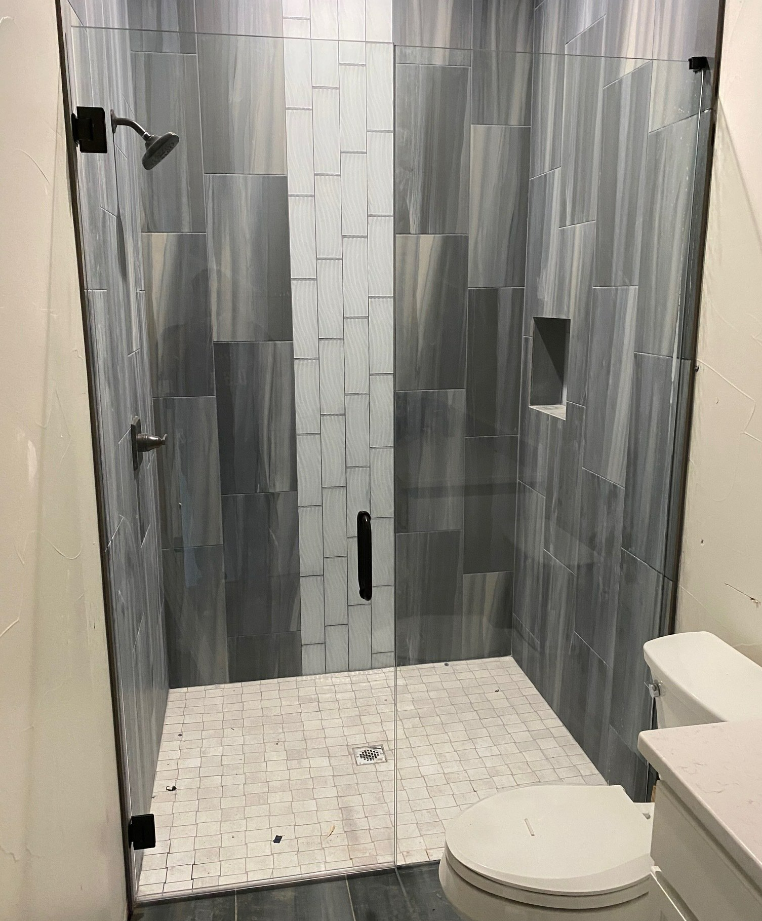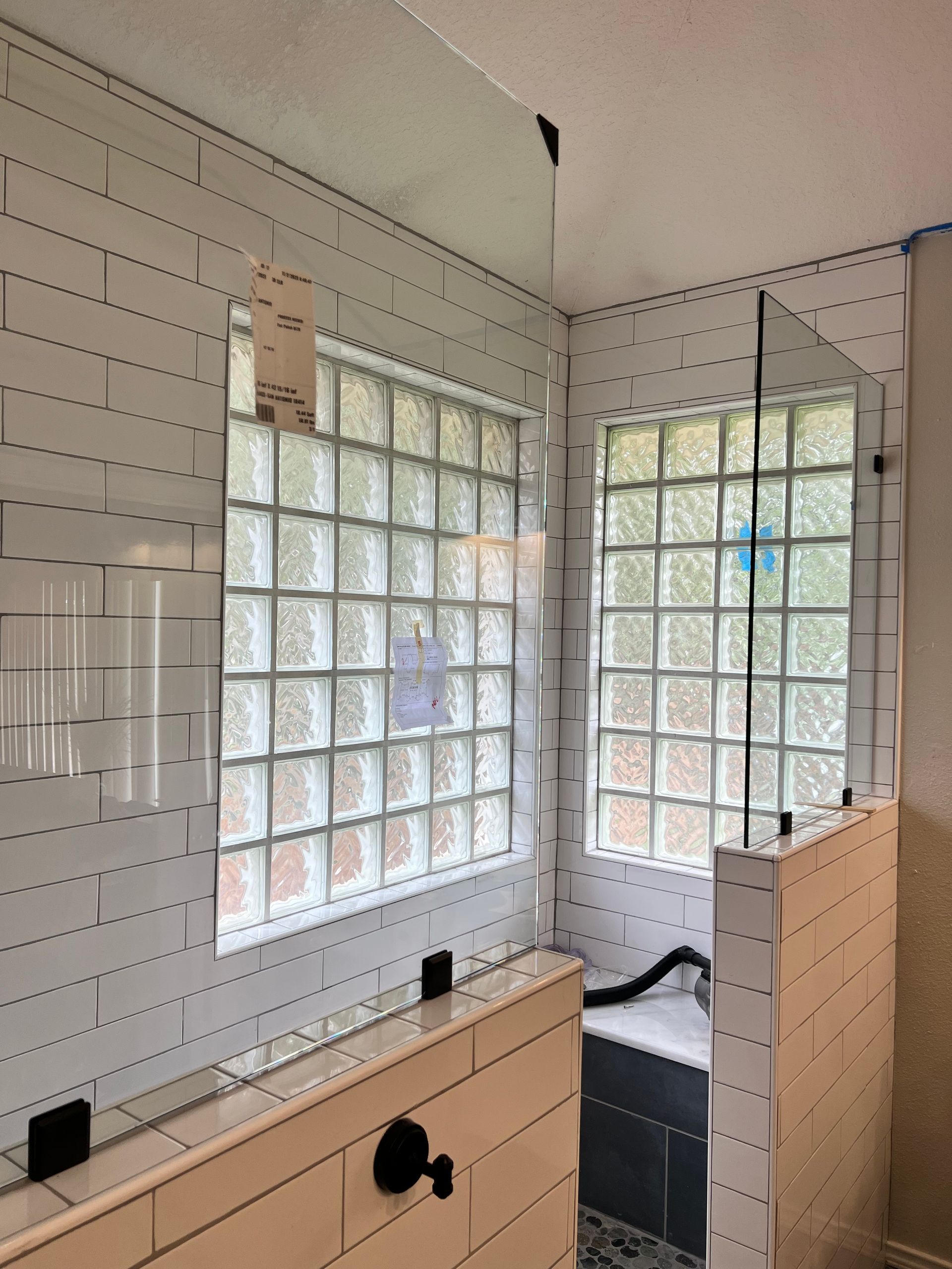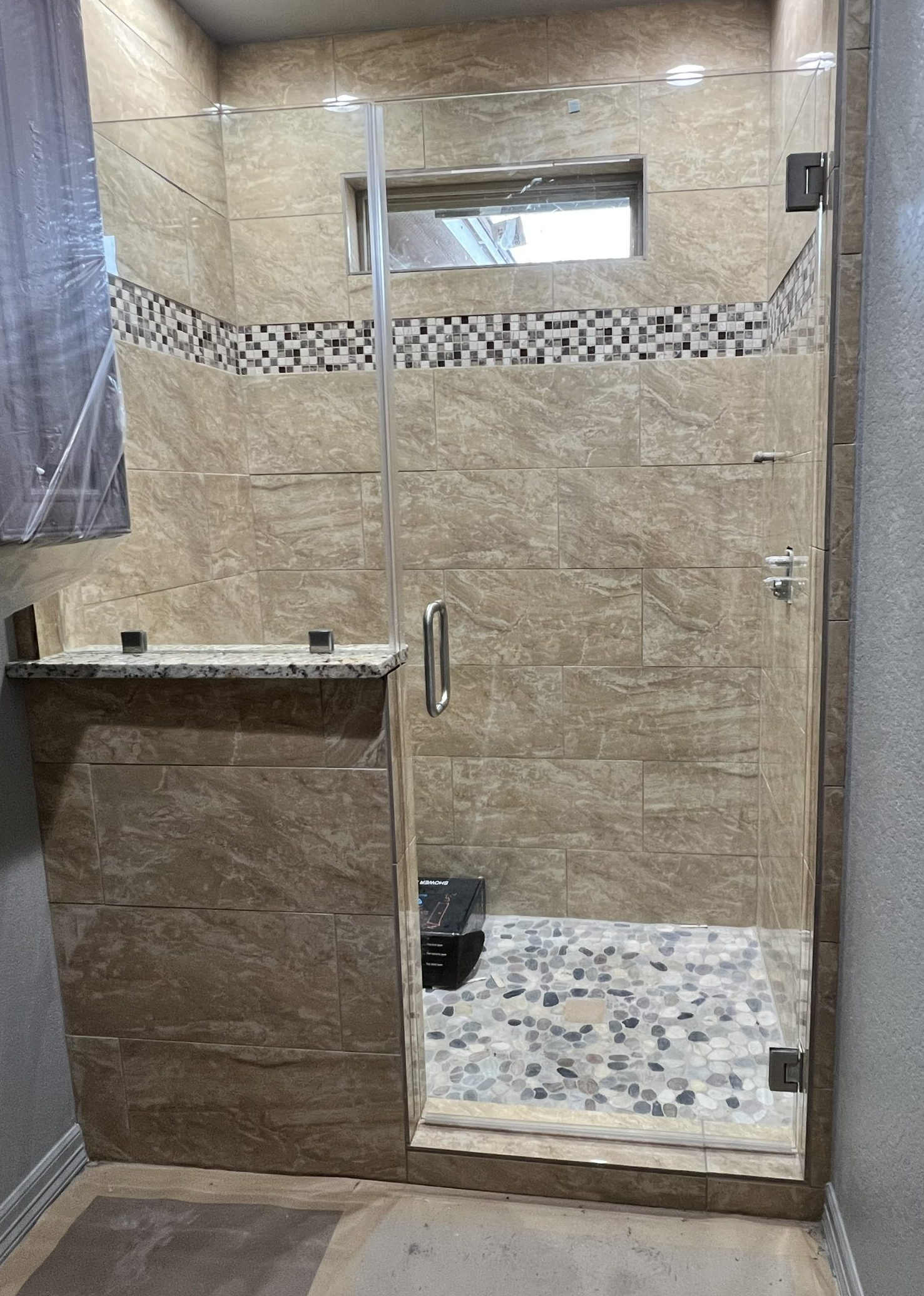 BROKEN UNIT REPLACMENT - NEW UNIT INSTALLED FRAMELESS INLINE STYLE WITH DOOR HINGED ON RIGHT AND FIXED PANEL ON LEFT - MATTE BLACK FINISH HARDWARE ON CLEAR GLASS.