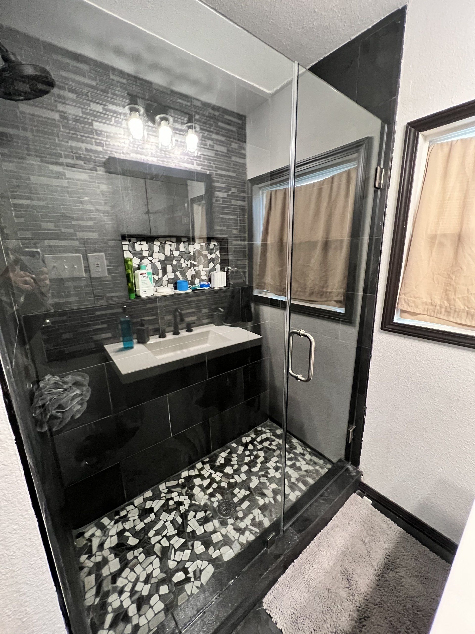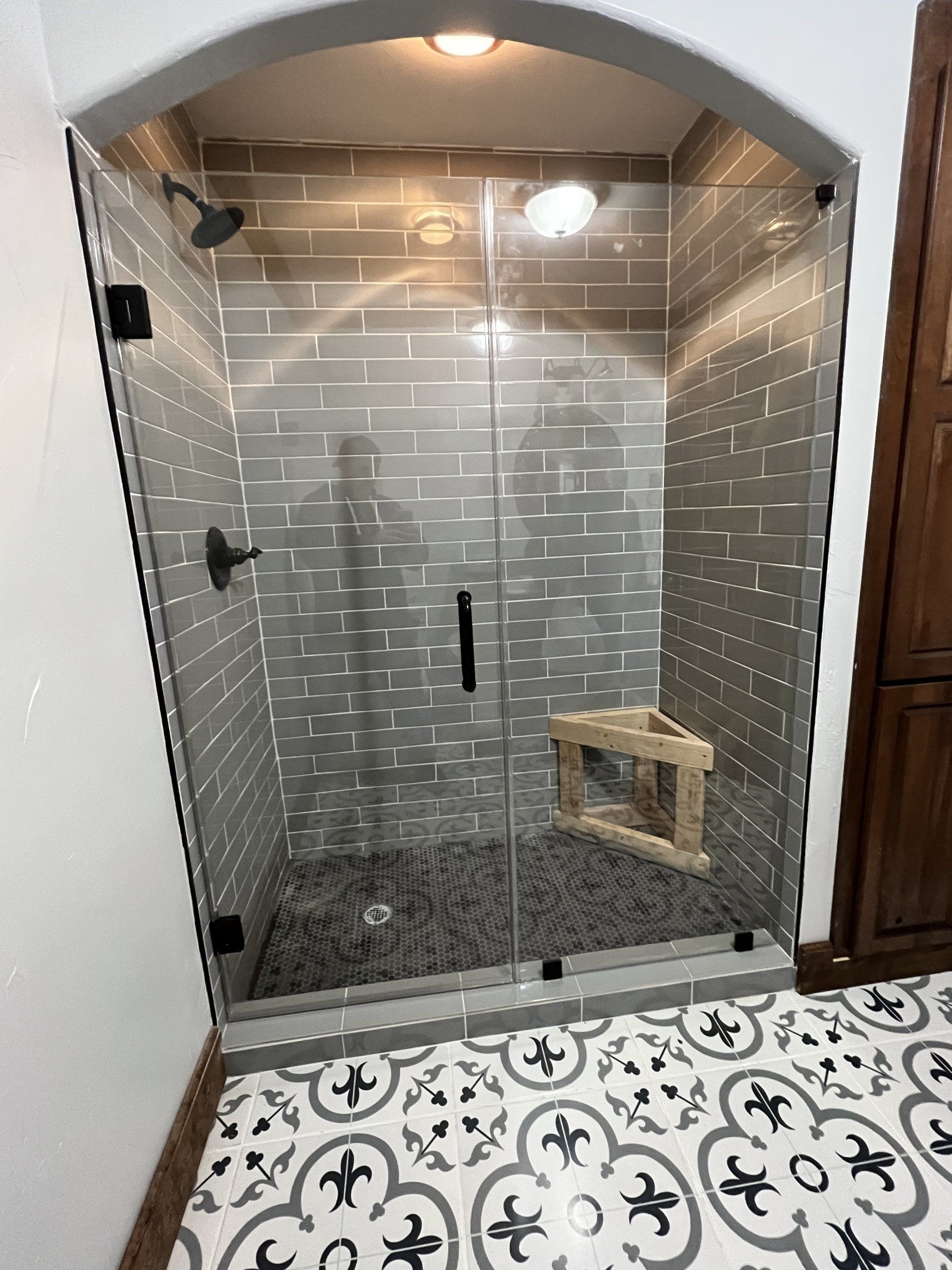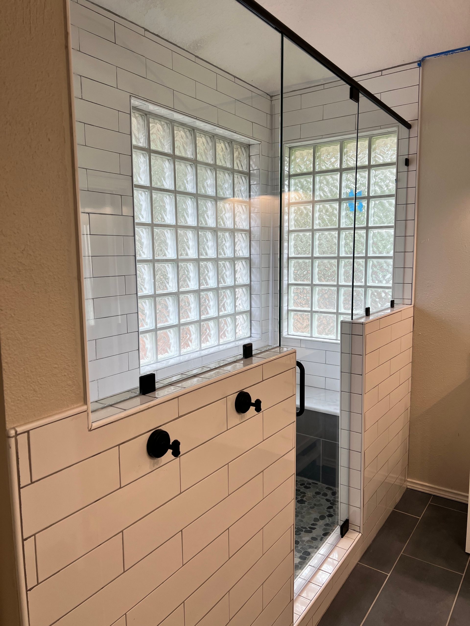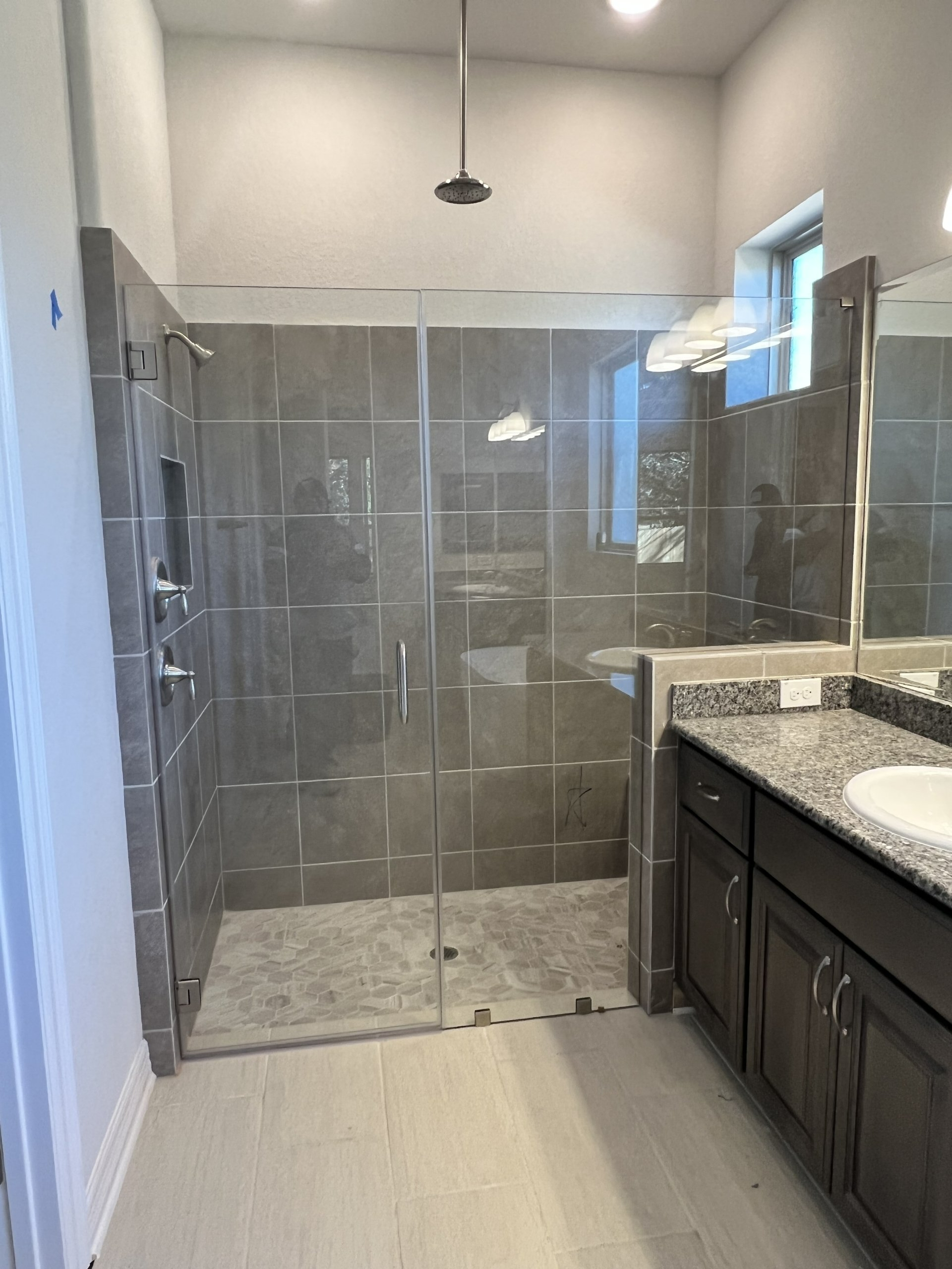 BROKEN UNIT REPLACMENT - NEW UNIT INSTALLED FRAMELESS INLINE STYLE WITH DOOR HINGED ON RIGHT AND FIXED PANEL ON LEFT - MATTE BLACK FINISH HARDWARE ON CLEAR GLASS.