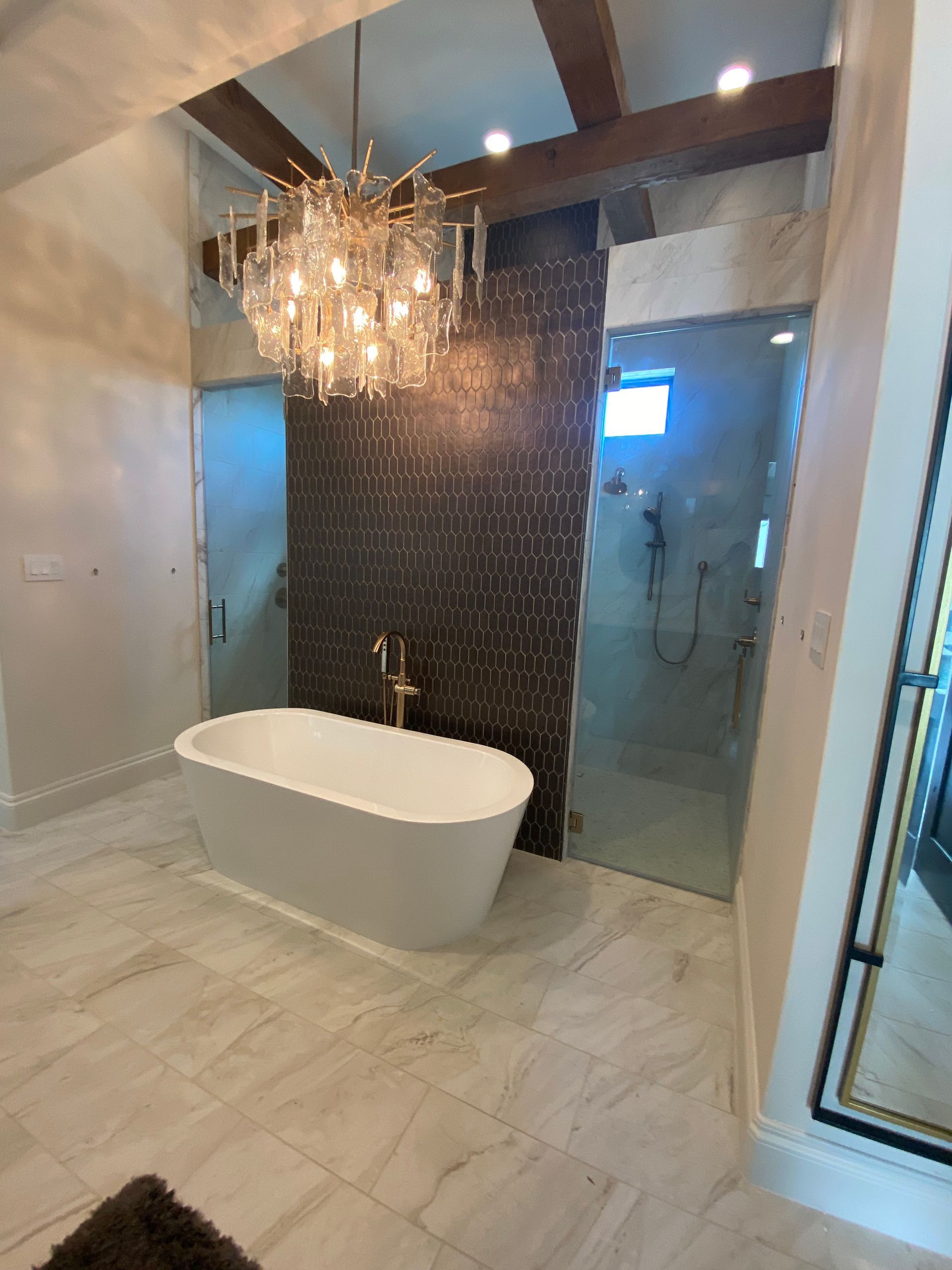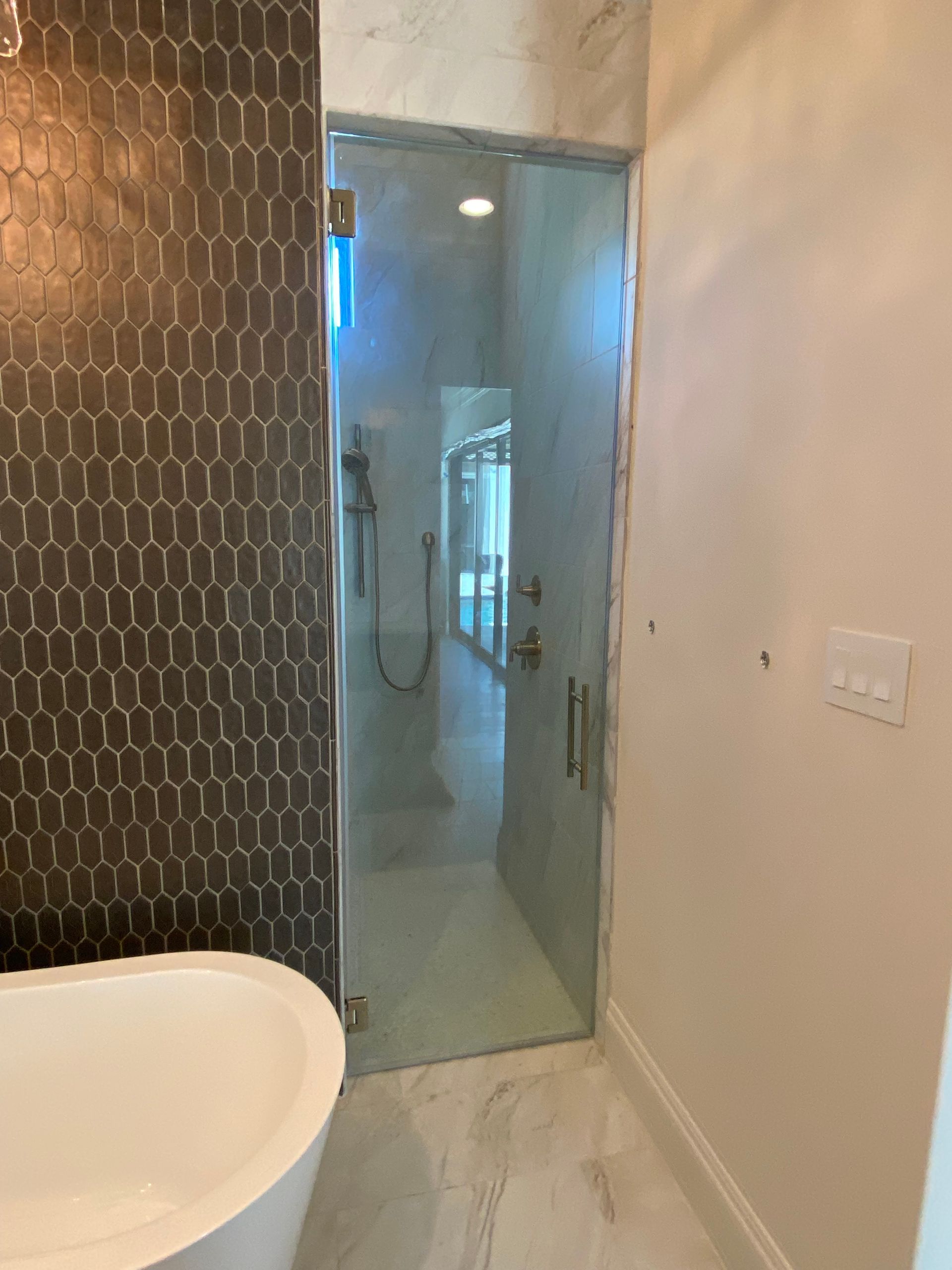 SINGLE SWING DOOR WITH FIXED PANEL WINDOW. BRUSH NICKEL FINISH HARDWARE ON FRAMELESS 3/8" CLEAR TEMPERED GLASS